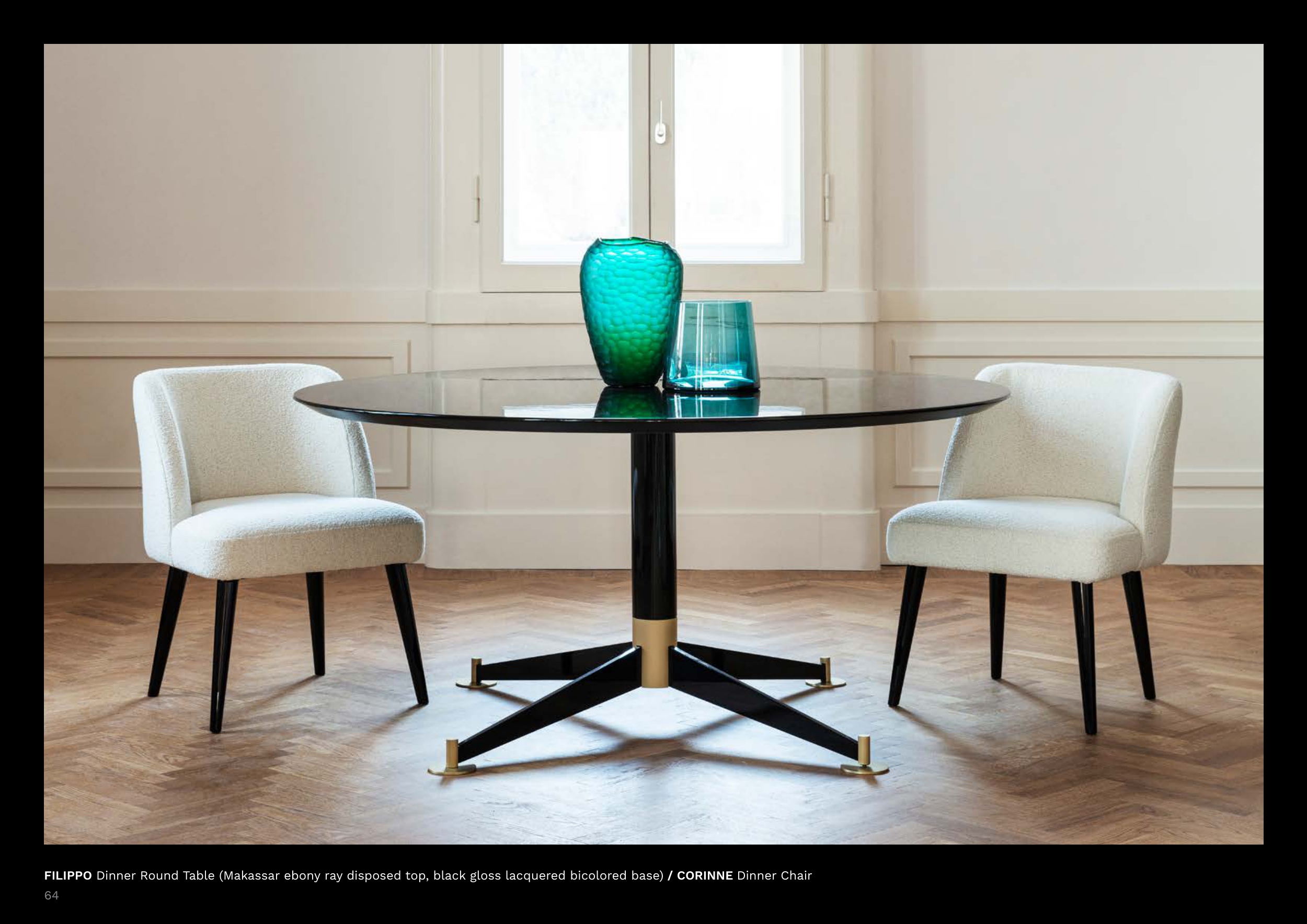 FILIPPO Dinner Round Table (Makassar ebony ray disposed top, black gloss lacquered bicolored base) / CORINNE Dinner Chair