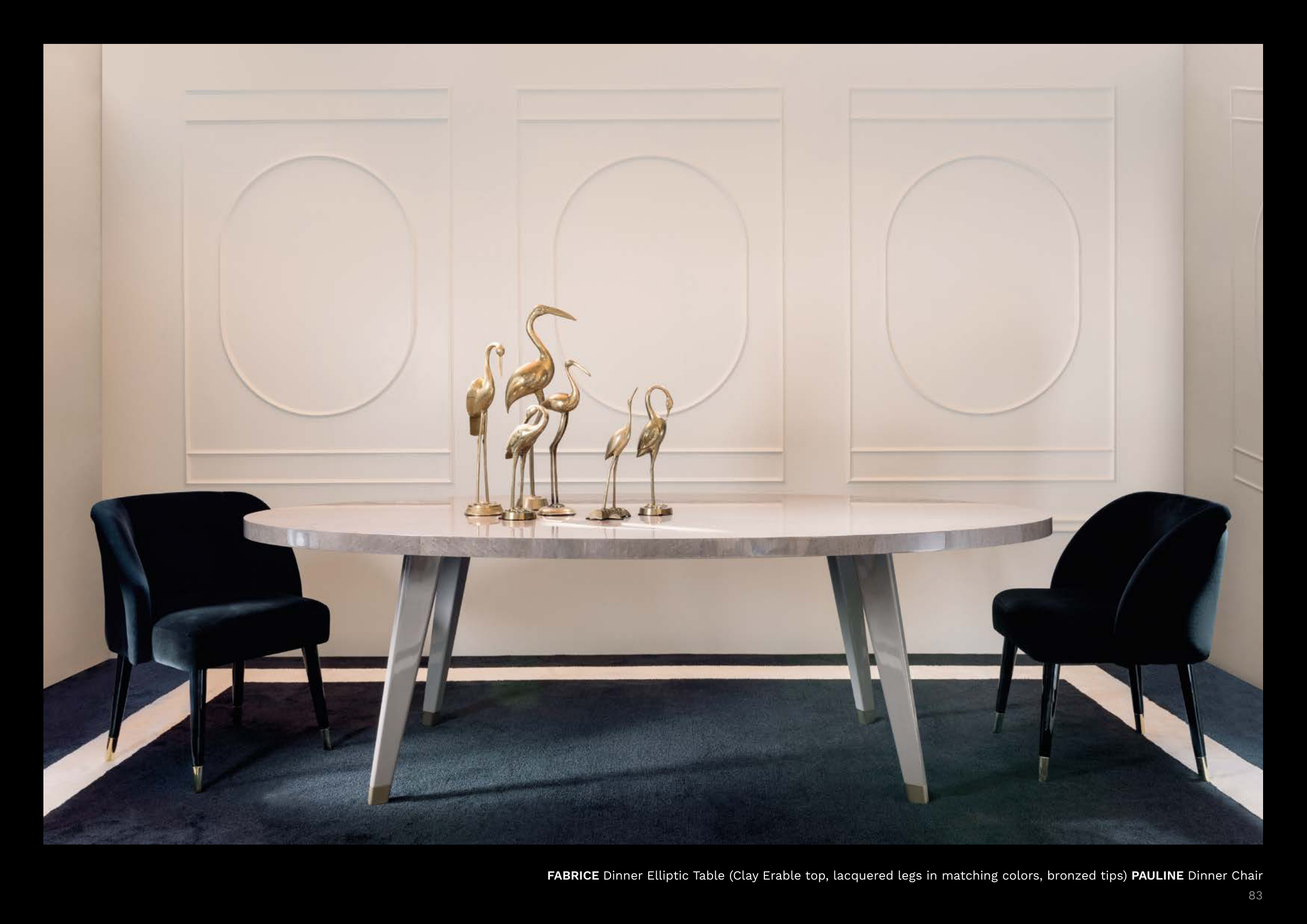 FABRICE Dinner Elliptic Table (Clay Erable top, lacquered legs in matching colors, bronzed tips) PAULINE Dinner Chair