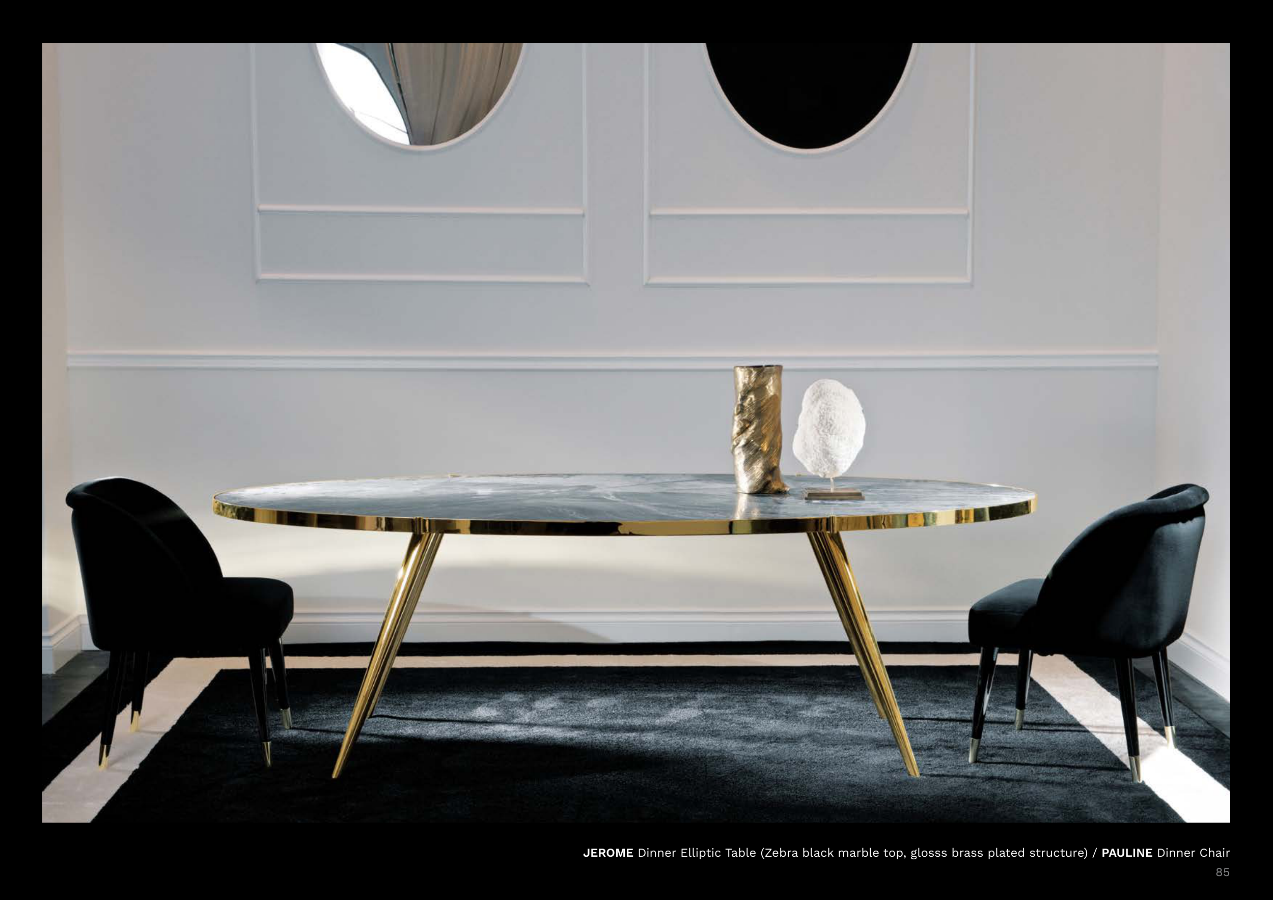 JEROME Dinner Elliptic Table (Zebra black marble top, glosss brass plated structure) / PAULINE Dinner Chair