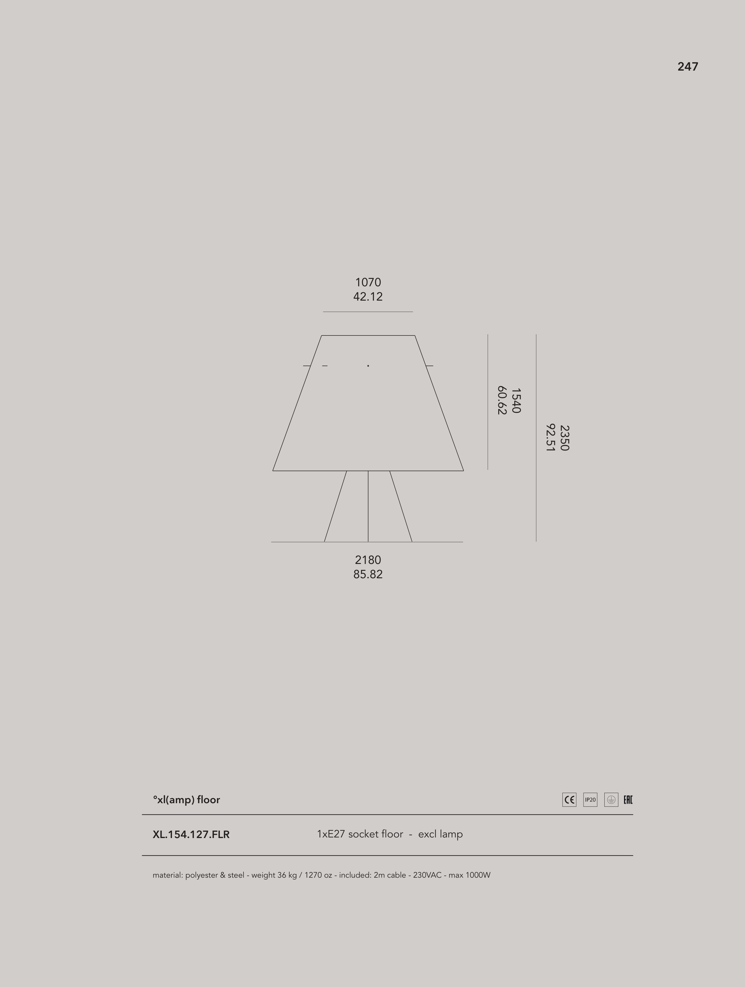 material: polyester & steel - weight 36 kg / 1270 oz - included: 2m cable - 230VAC - max 1000W