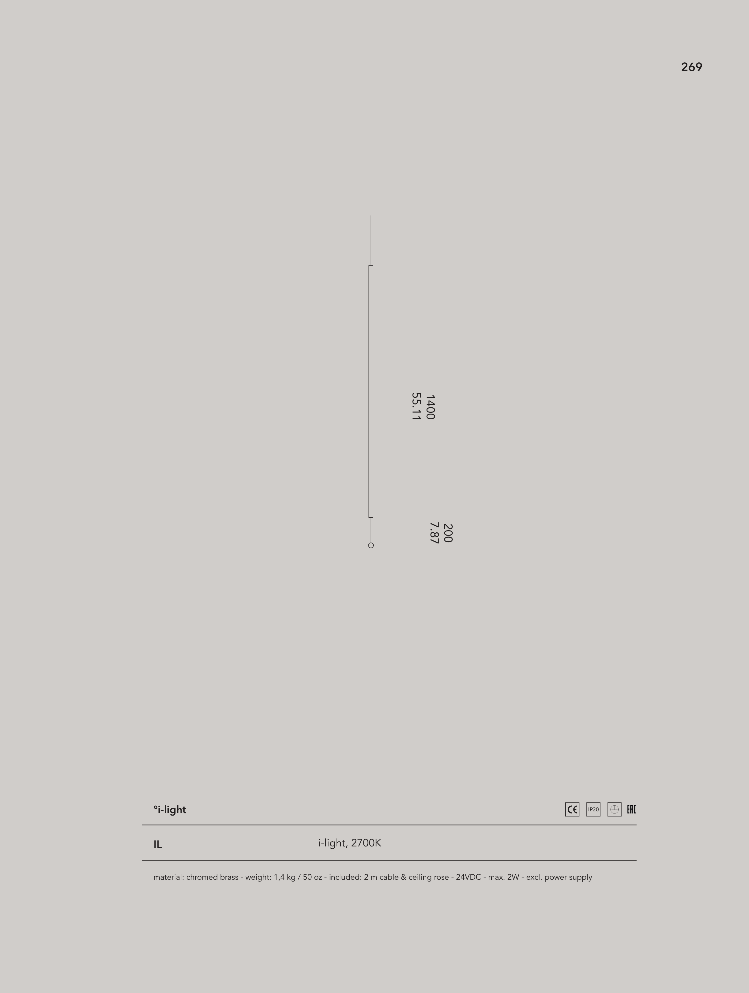 material: chromed brass - weight: 1,4 kg / 50 oz - included: 2 m cable & ceiling rose - 24VDC - max. 2W - excl. power supply