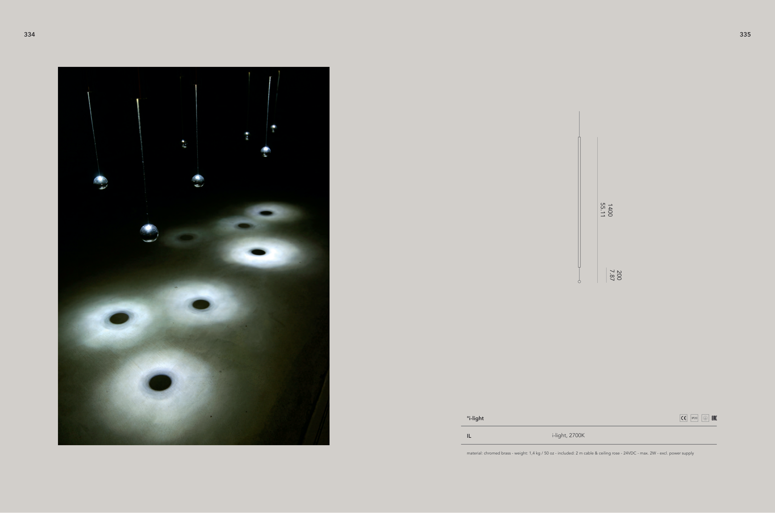 material: chromed brass - weight: 1,4 kg / 50 oz - included: 2 m cable & ceiling rose - 24VDC - max. 2W - excl. power supply
