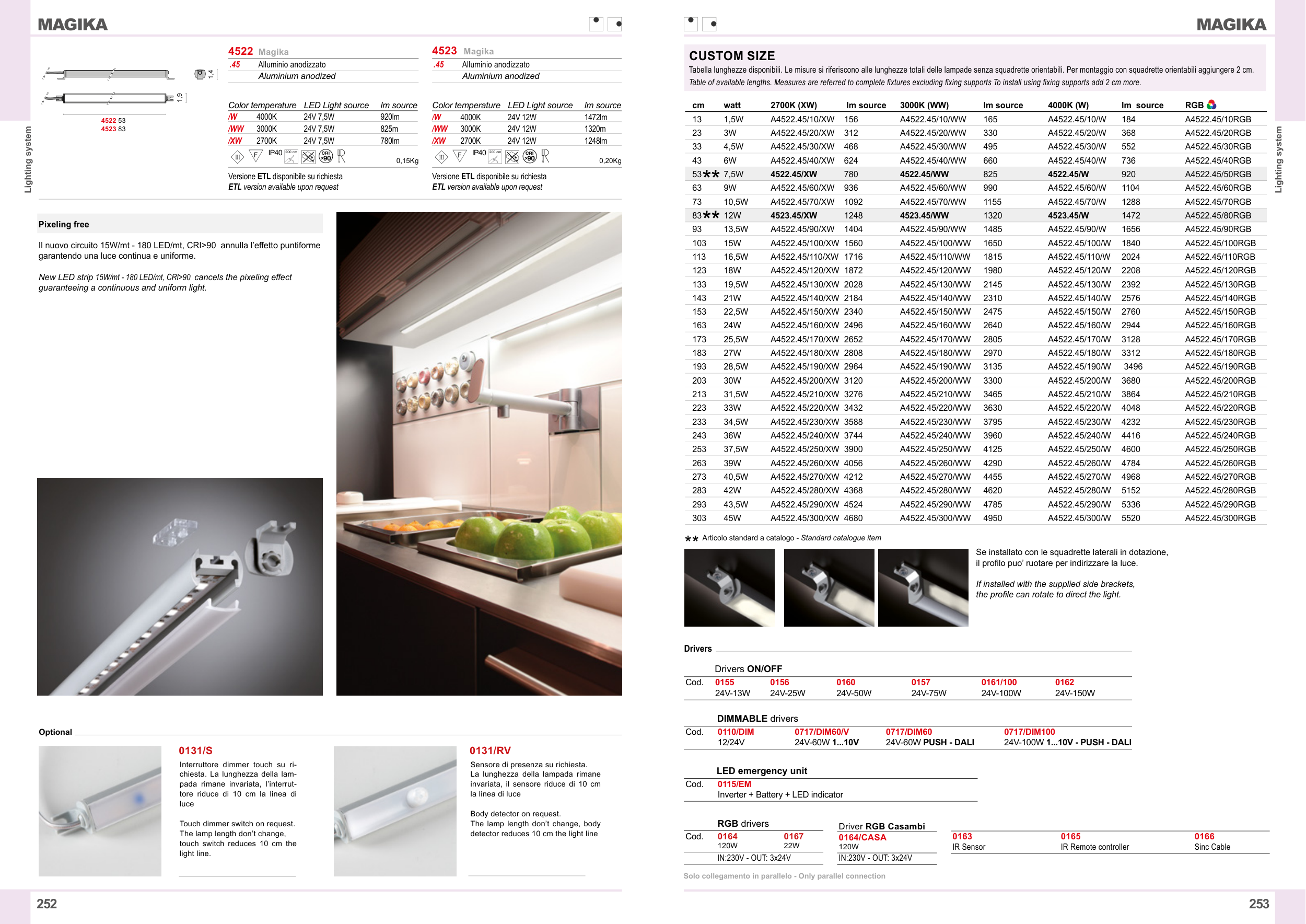 Tabella lunghezze disponibili. Le misure si riferiscono alle lunghezze totali delle lampade senza squadrette orientabili. Per montaggio con squadrette orientabili aggiungere 2 cm.