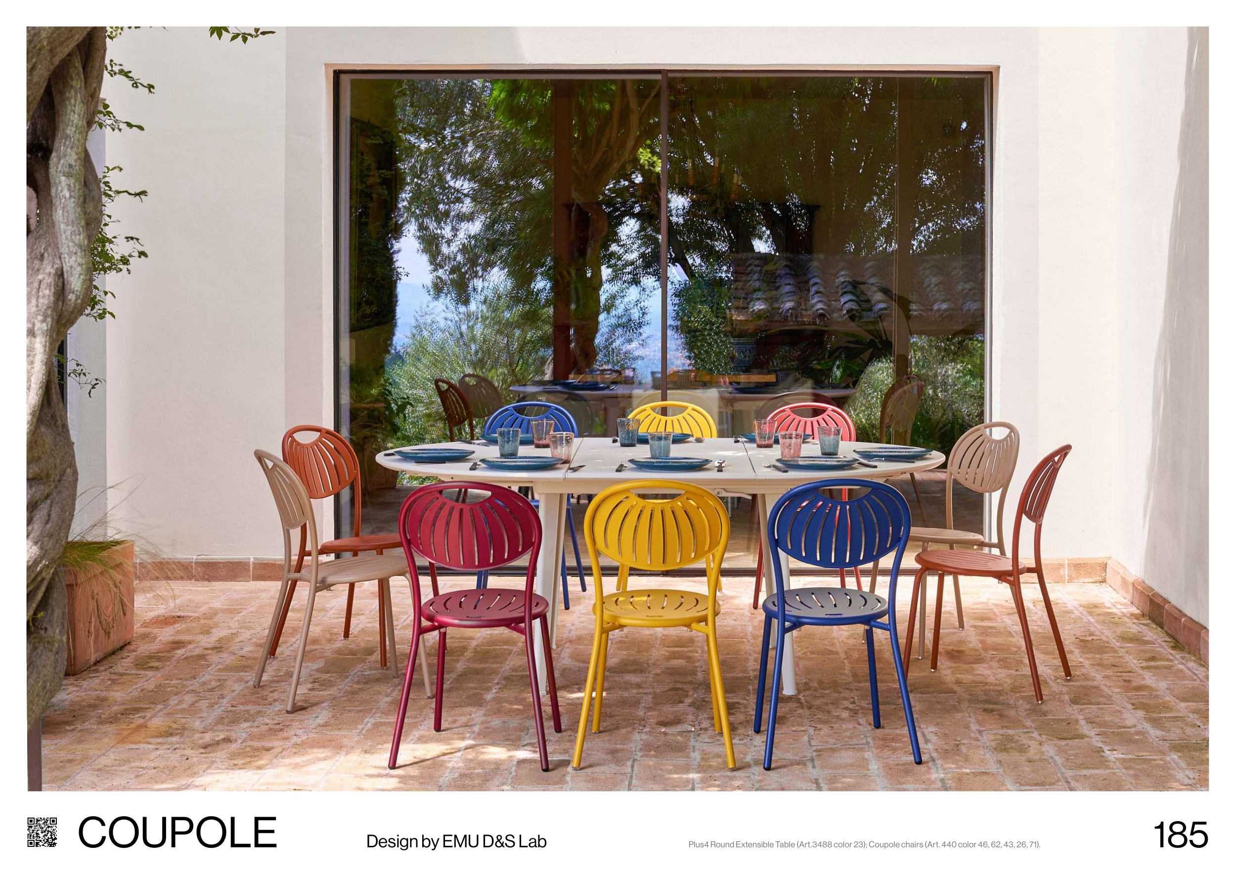 Plus4 Round Extensible Table (Art.3488 color 23); Coupole chairs (Art. 440 color 46, 62, 43, 26, 71).