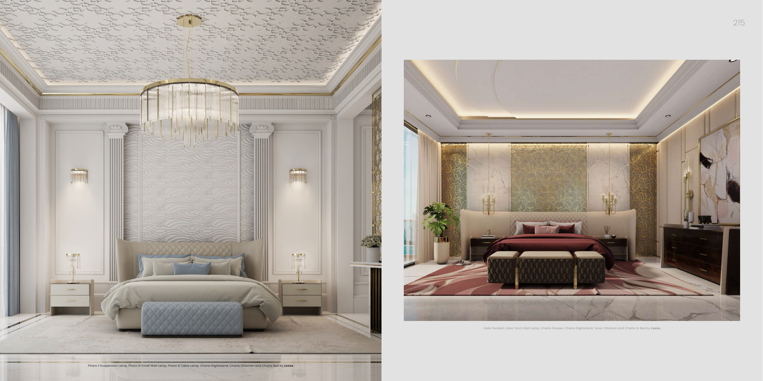 214 215 Gala Pendant, Gala Torch Wall Lamp ,Charla Dresser, Charla Nightstand, Tenor Ottoman and Charla XL Bed by Luxxu Pharo II Suspension Lamp, Pharo III Small Wall Lamp, Pharo III Table Lamp, Charla Nightstand, Charla Ottoman and Charla Bed by Luxxu