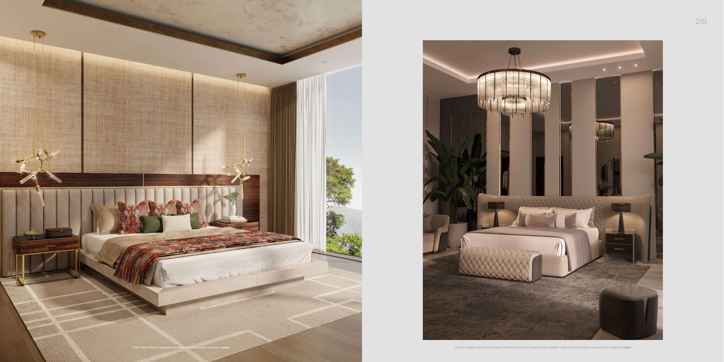 Charla XL Bed, Charla NightStand, Charla Ottoman, Charla Stool, Needle Table Lamp and Pharo Suspension Lamp by Luxxu