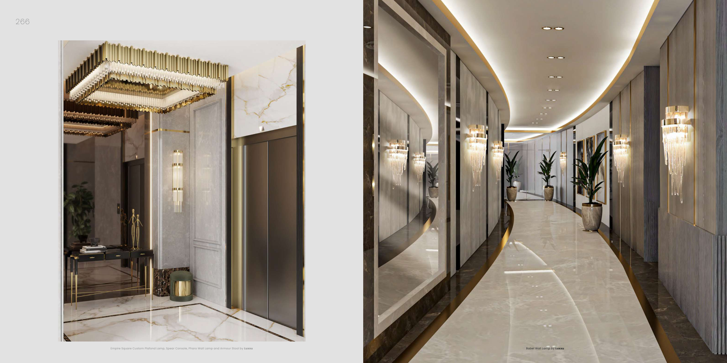 Empire Square Custom Plafond Lamp, Spear Console, Pharo Wall Lamp and Armour Stool by Luxxu