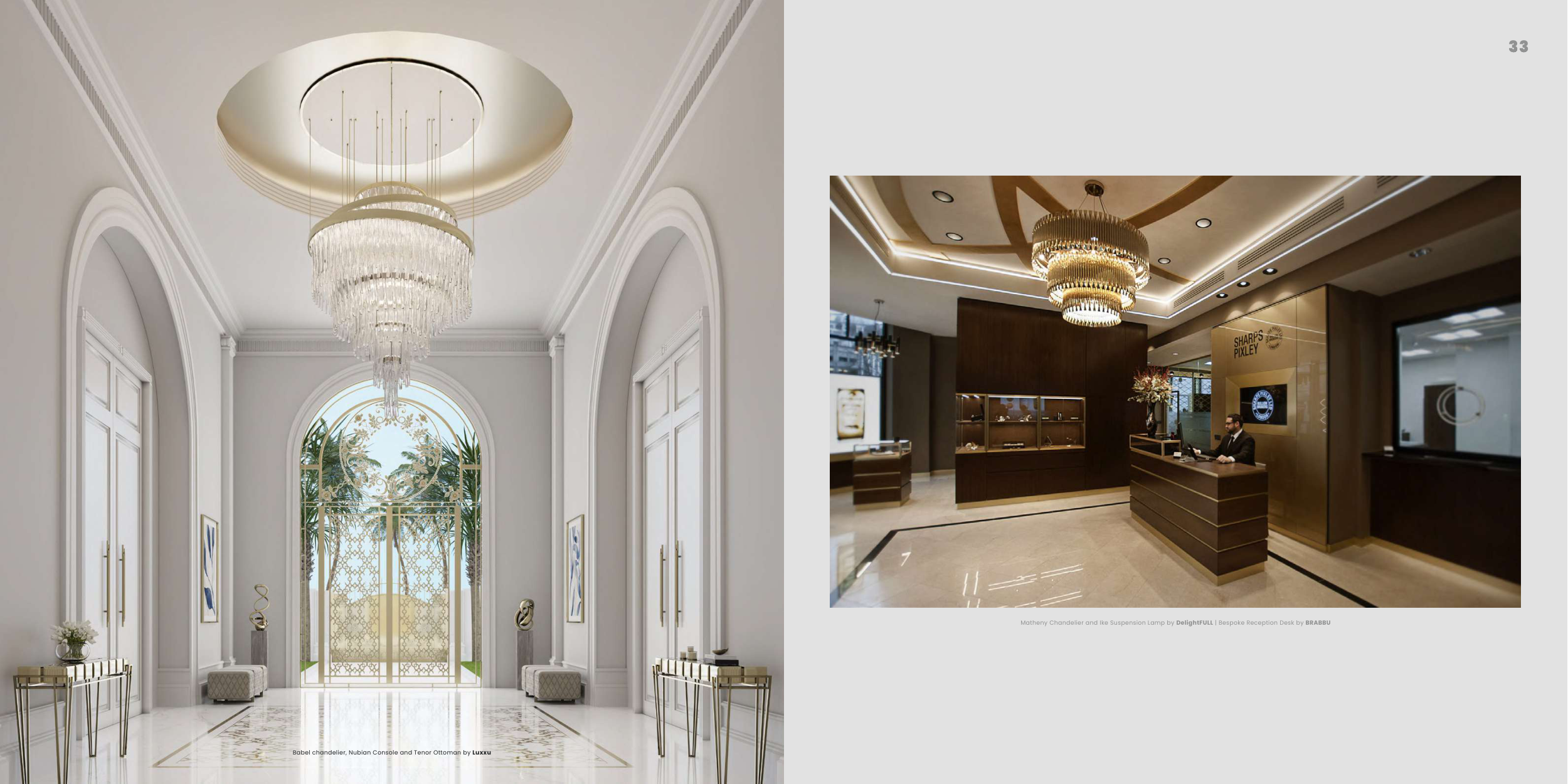 Matheny Chandelier and Ike Suspension Lamp by DelightFULL | Bespoke Reception Desk by BRABBU
