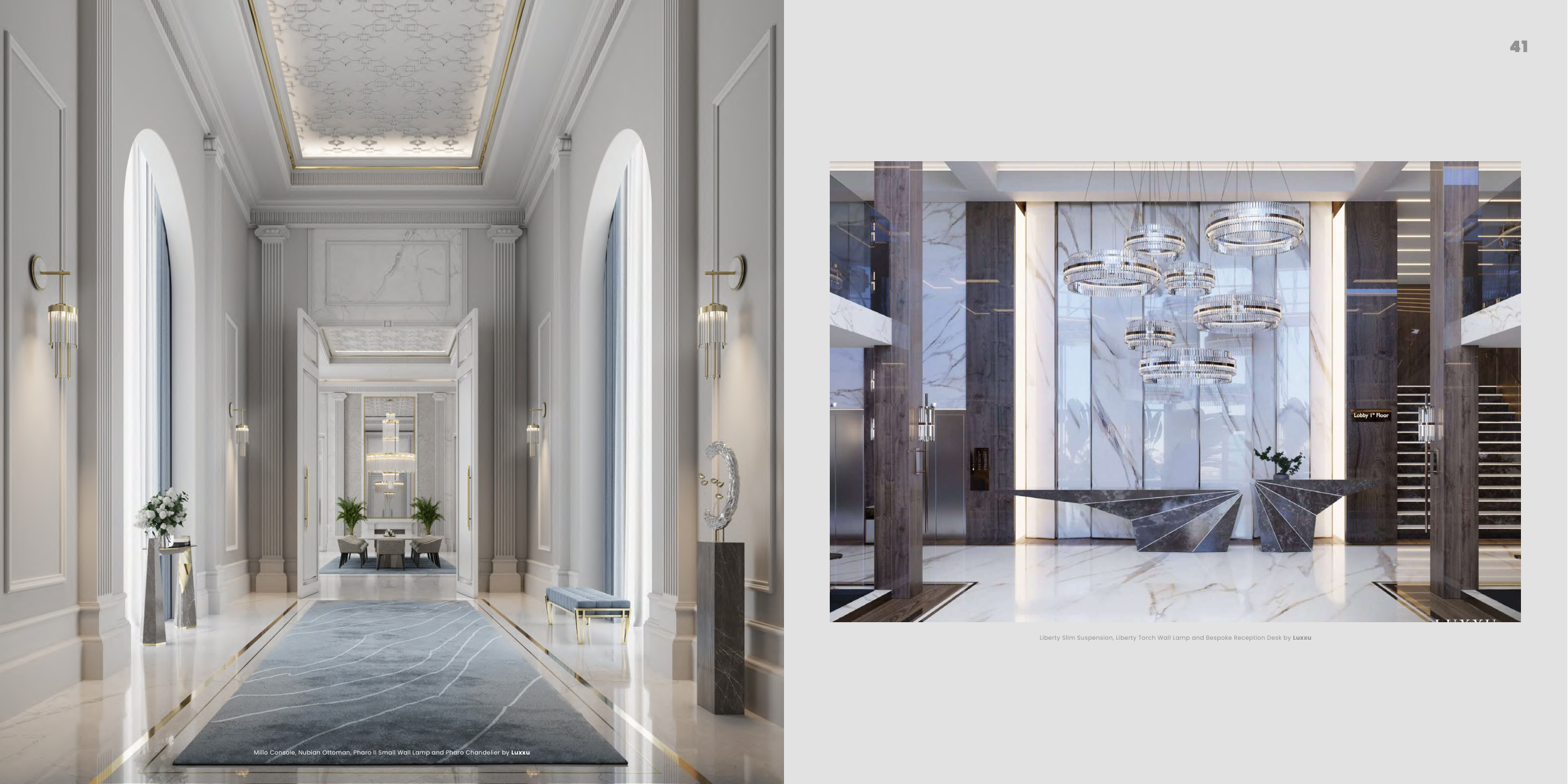 Millo Console, Nubian Ottoman, Pharo II Small Wall Lamp and Pharo Chandelier by Luxxu