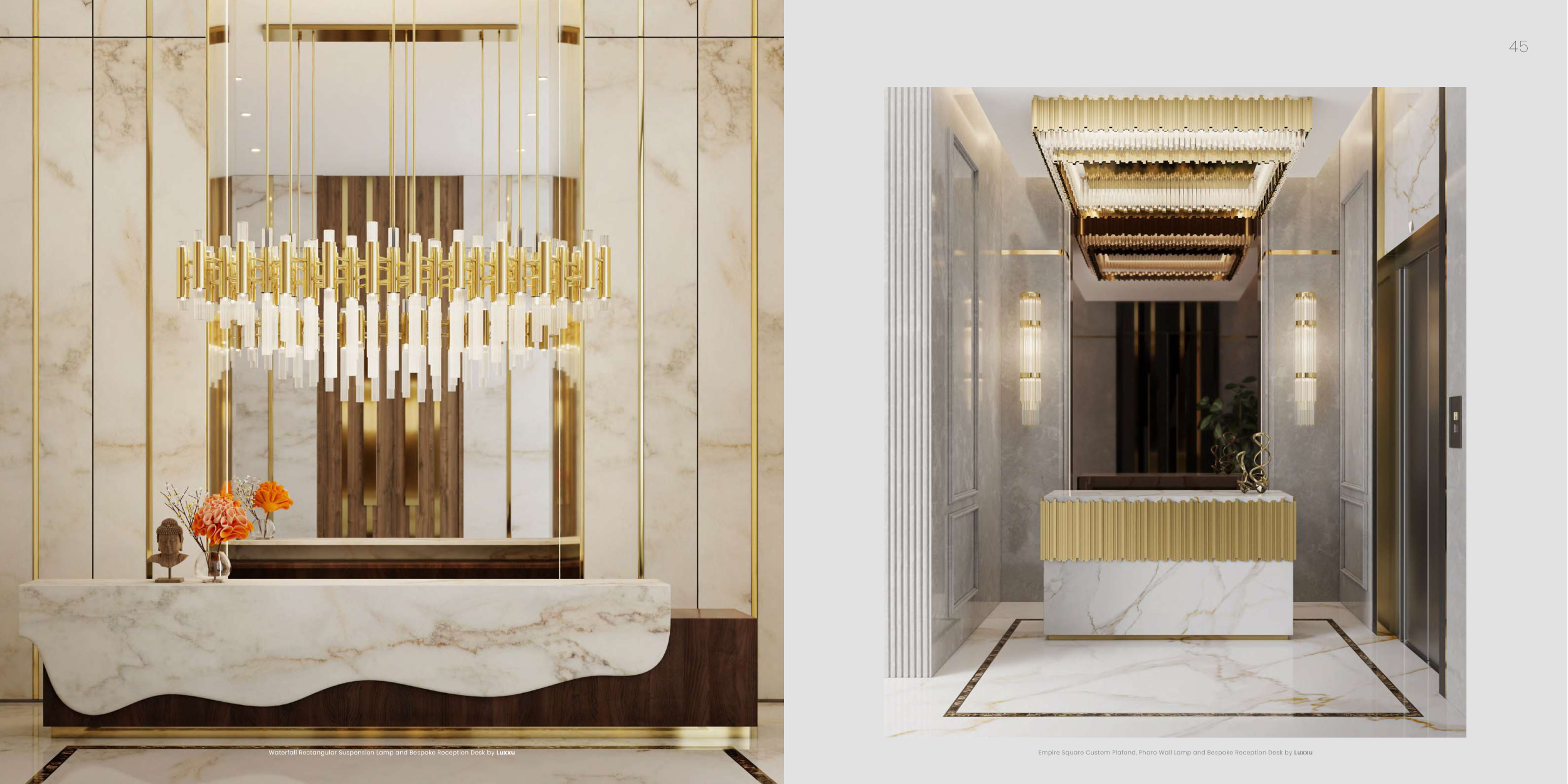 Empire Square Custom Plafond, Pharo Wall Lamp and Bespoke Reception Desk by Luxxu