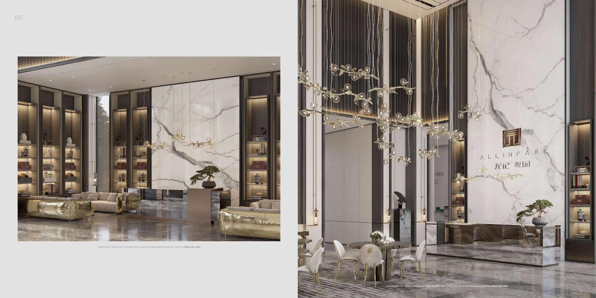 Fortuna Round Table, Soleil Chair, Hera Suspension Lamp and Bespoke Reception Desk by Boca do Lobo