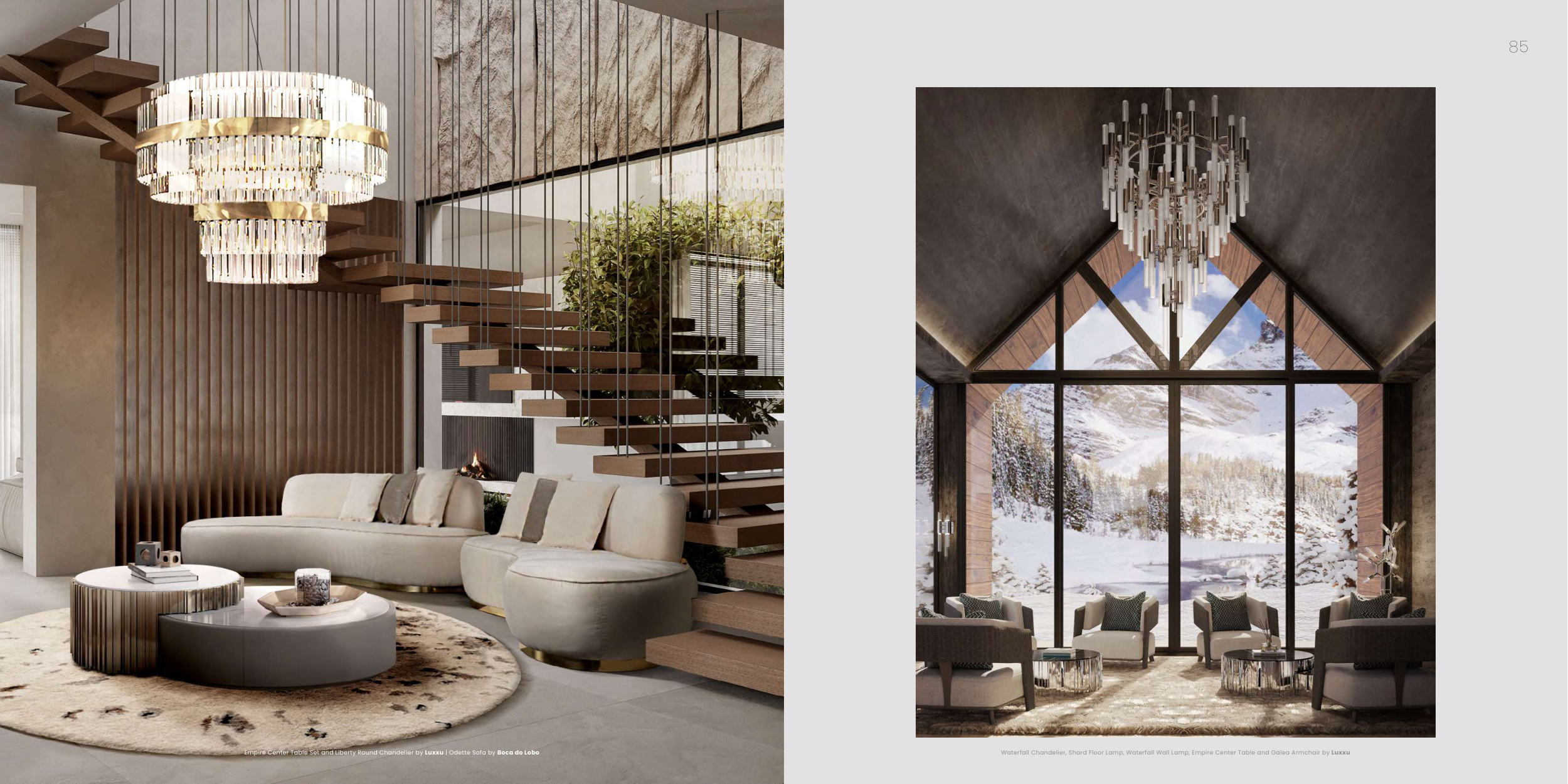 Waterfall Chandelier, Shard Floor Lamp, Waterfall Wall Lamp, Empire Center Table and Galea Armchair by Luxxu