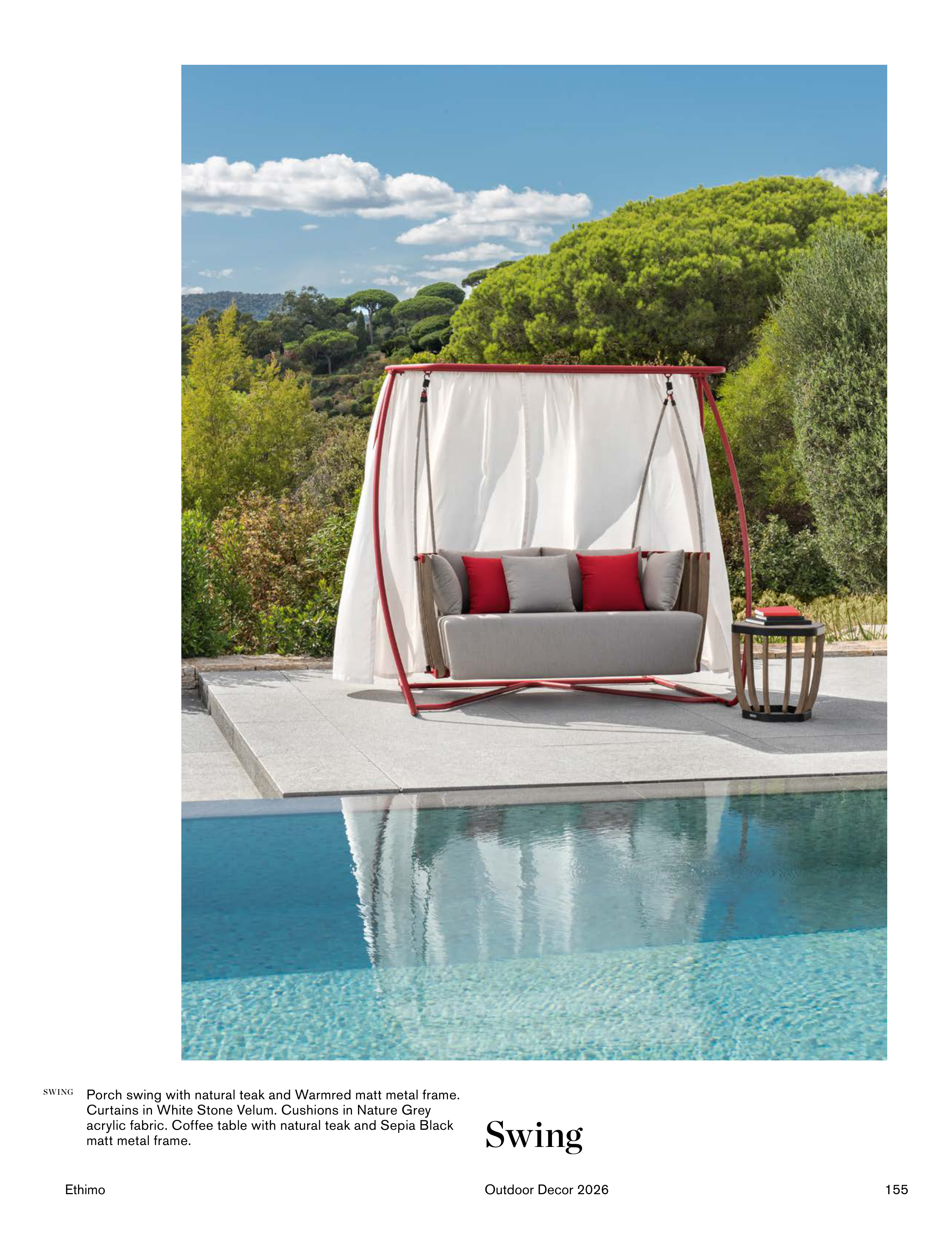 Porch swing with natural teak and Warmred matt metal frame.
