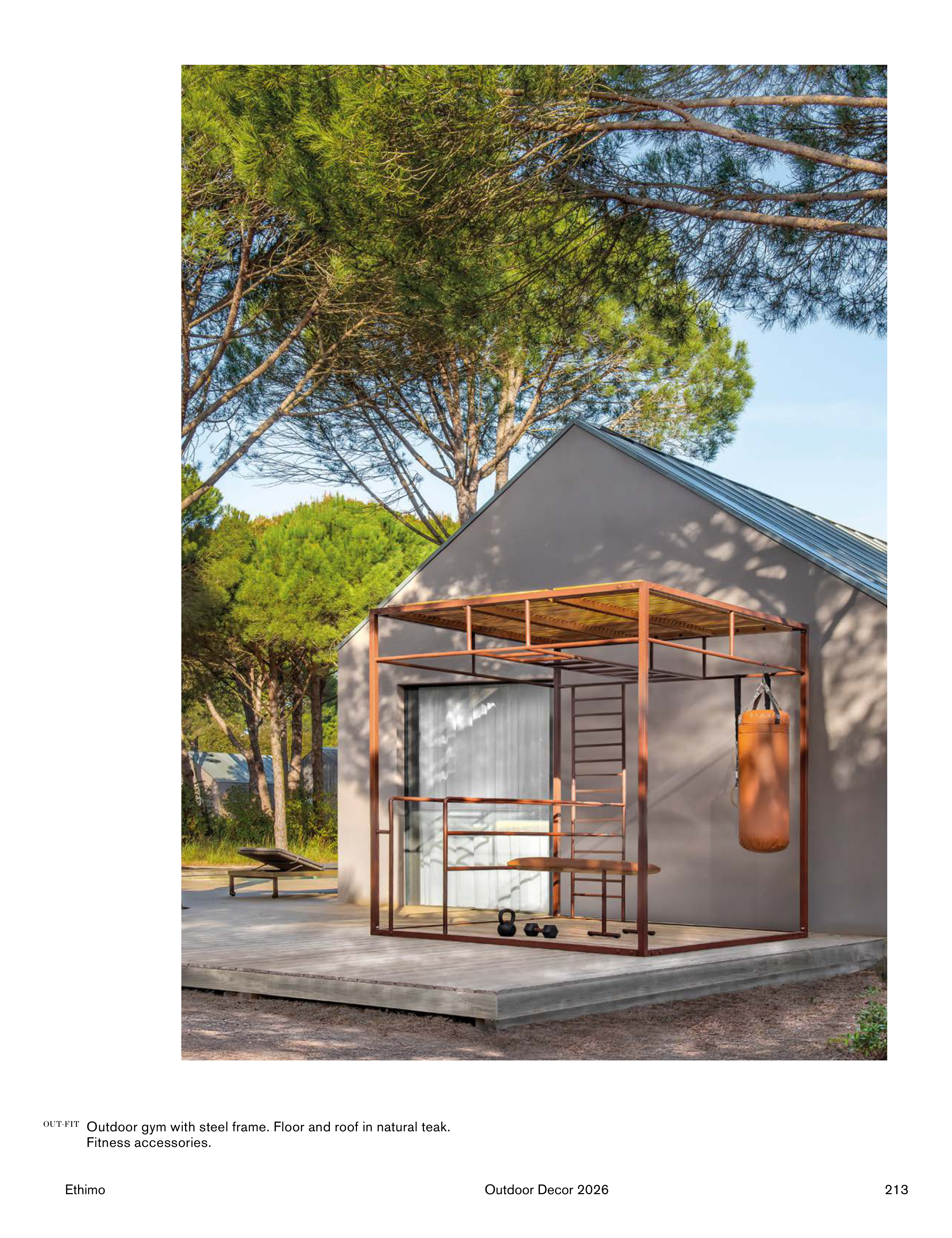 OUT-FIT Outdoor gym with steel frame. Floor and roof in natural teak.