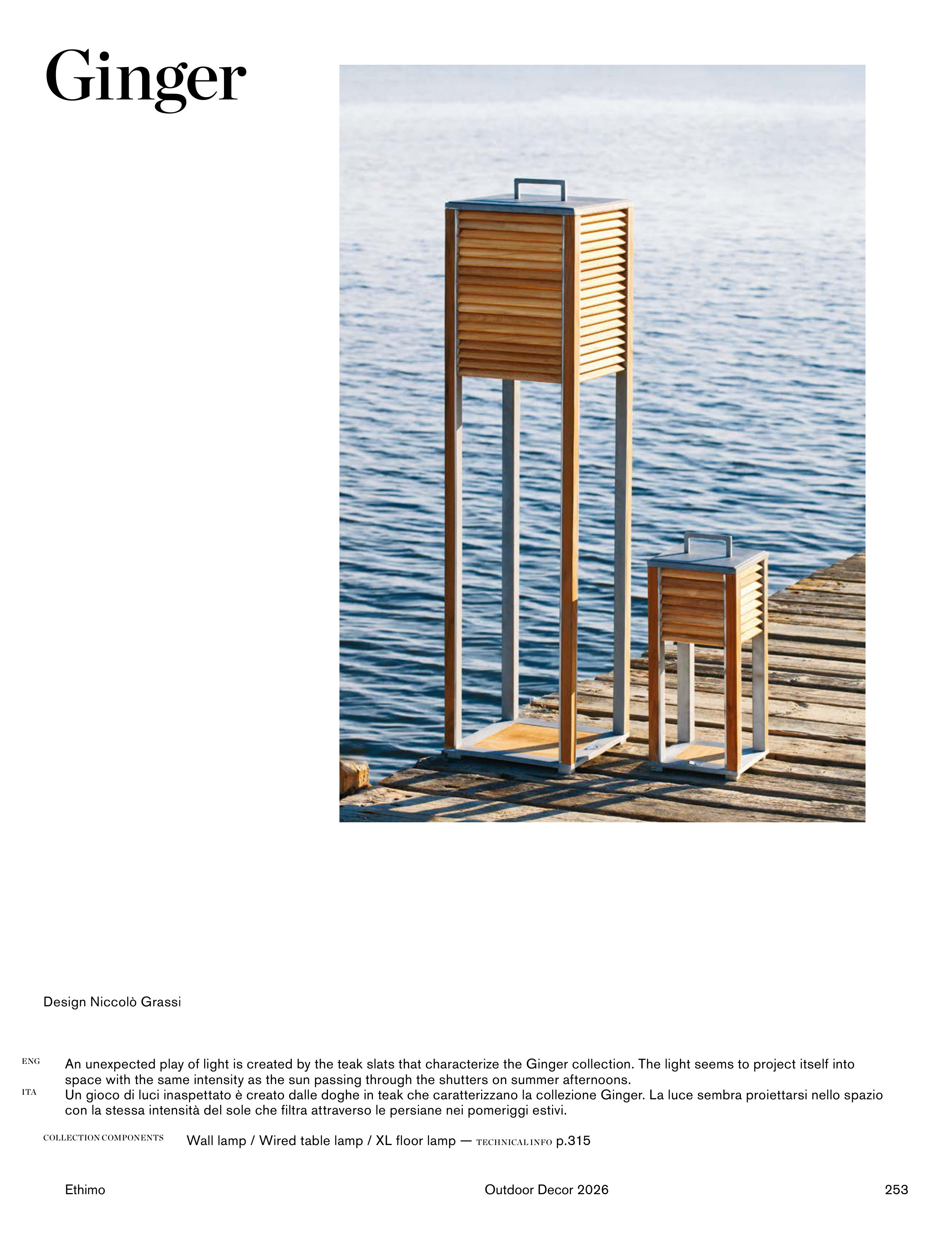 Un gioco di luci inaspettato è creato dalle doghe in teak che caratterizzano la collezione Ginger. La luce sembra proiettarsi nello spazio