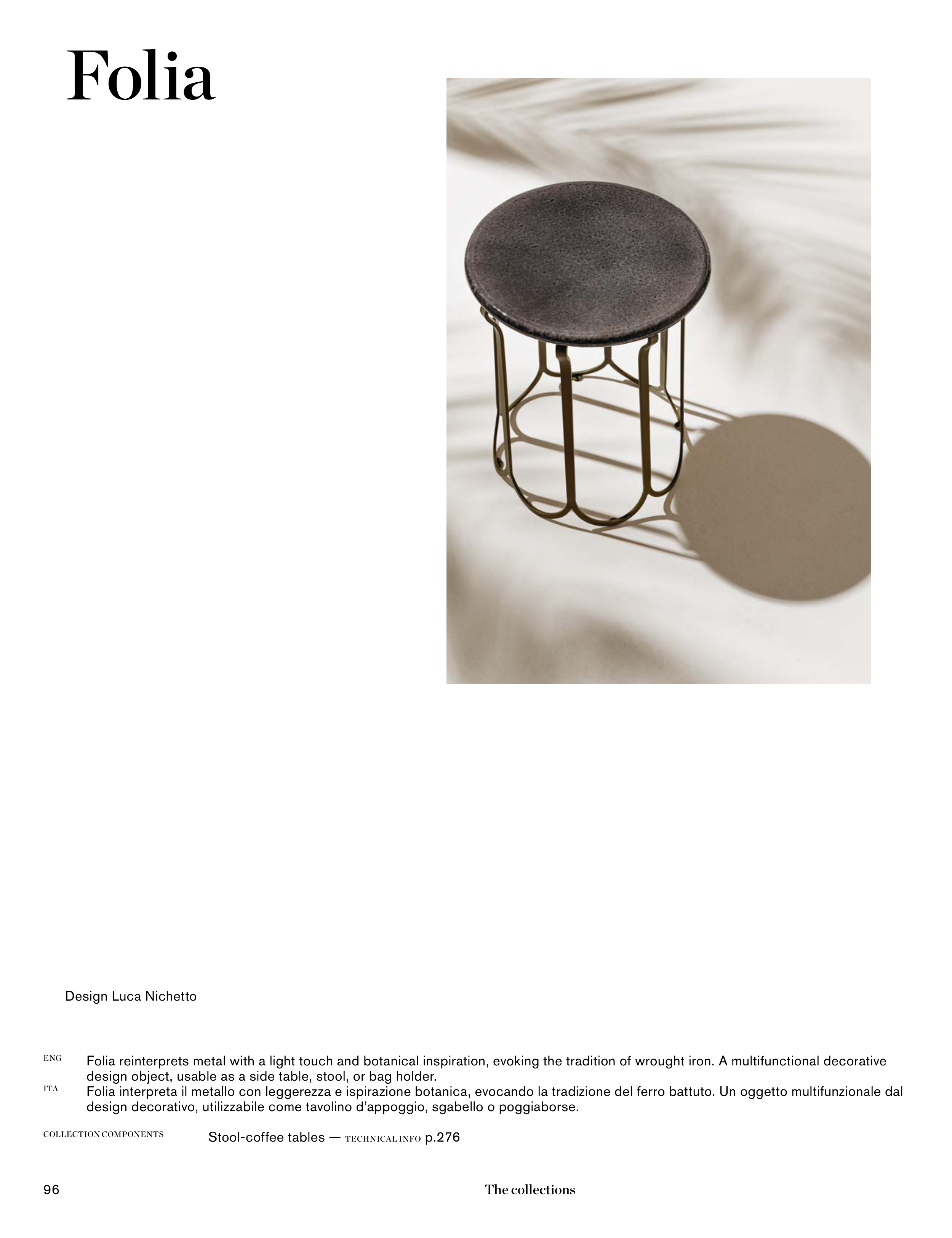Folia reinterprets metal with a light touch and botanical inspiration, evoking the tradition of wrought iron. A multifunctional decorative