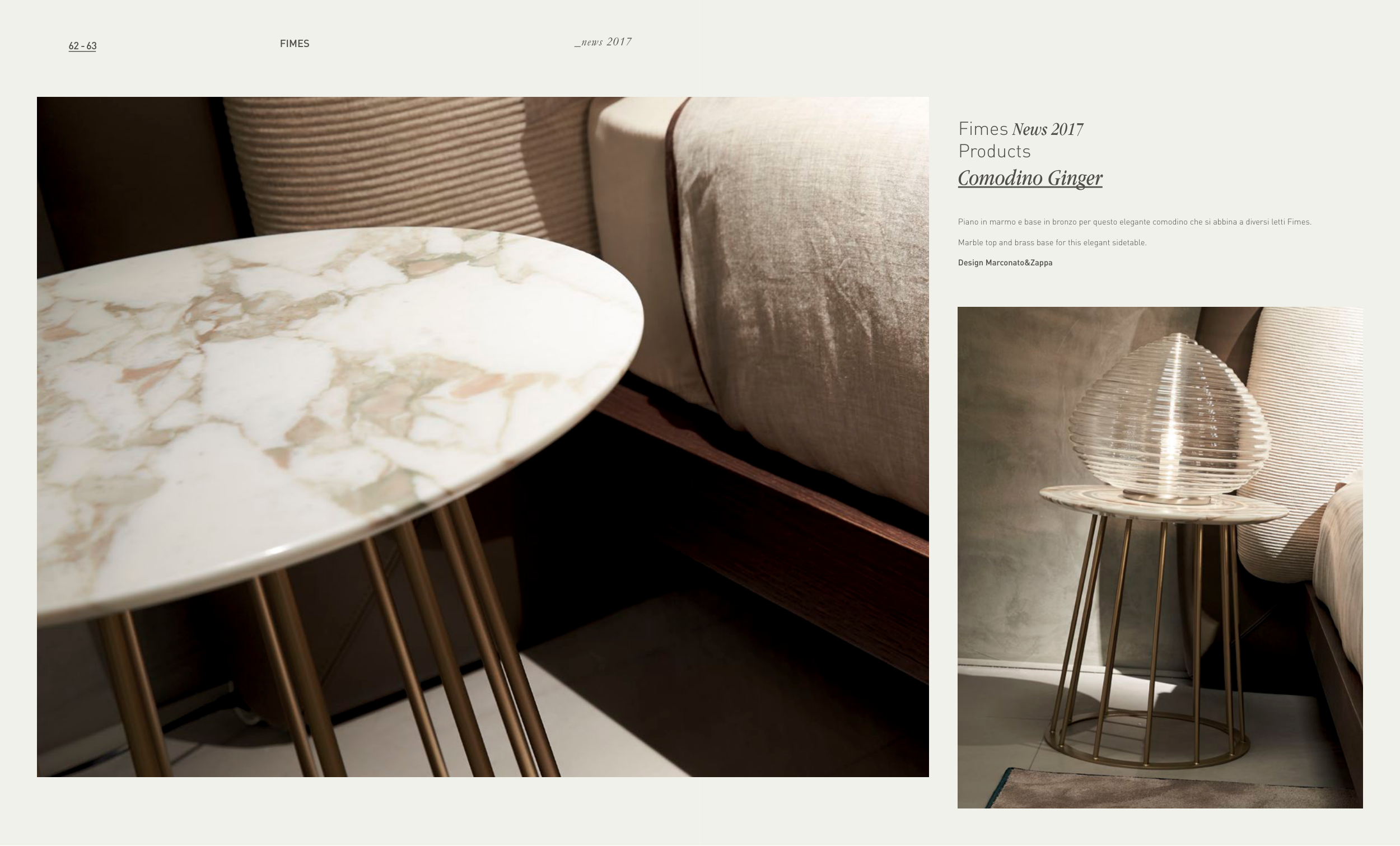 Fimes News 2017 Products Comodino Ginger _home design FIMES _news 2017 Piano in marmo e base in bronzo per questo elegante comodino che si abbina a diversi letti Fimes. Marble top and brass base for this elegant sidetable. Design Marconato&Zappa 62 - 63