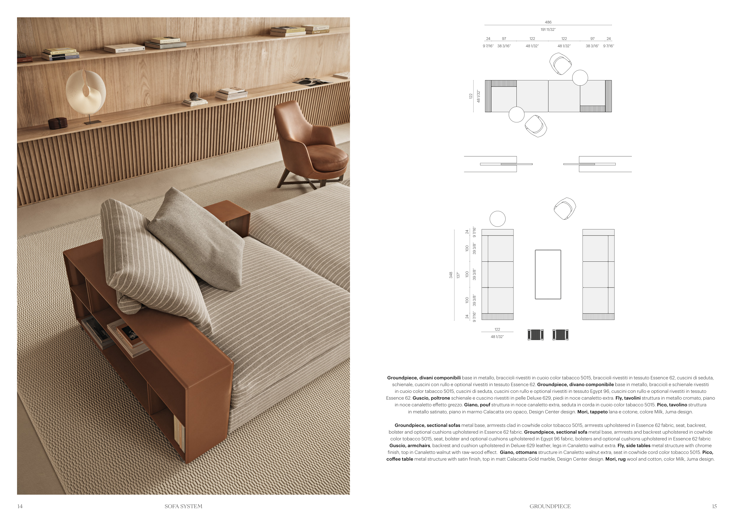 Groundpiece, divani componibili base in metallo, braccioli rivestiti in cuoio color tabacco 5015, braccioli rivestiti in tessuto Essence 62, cuscini di seduta,
