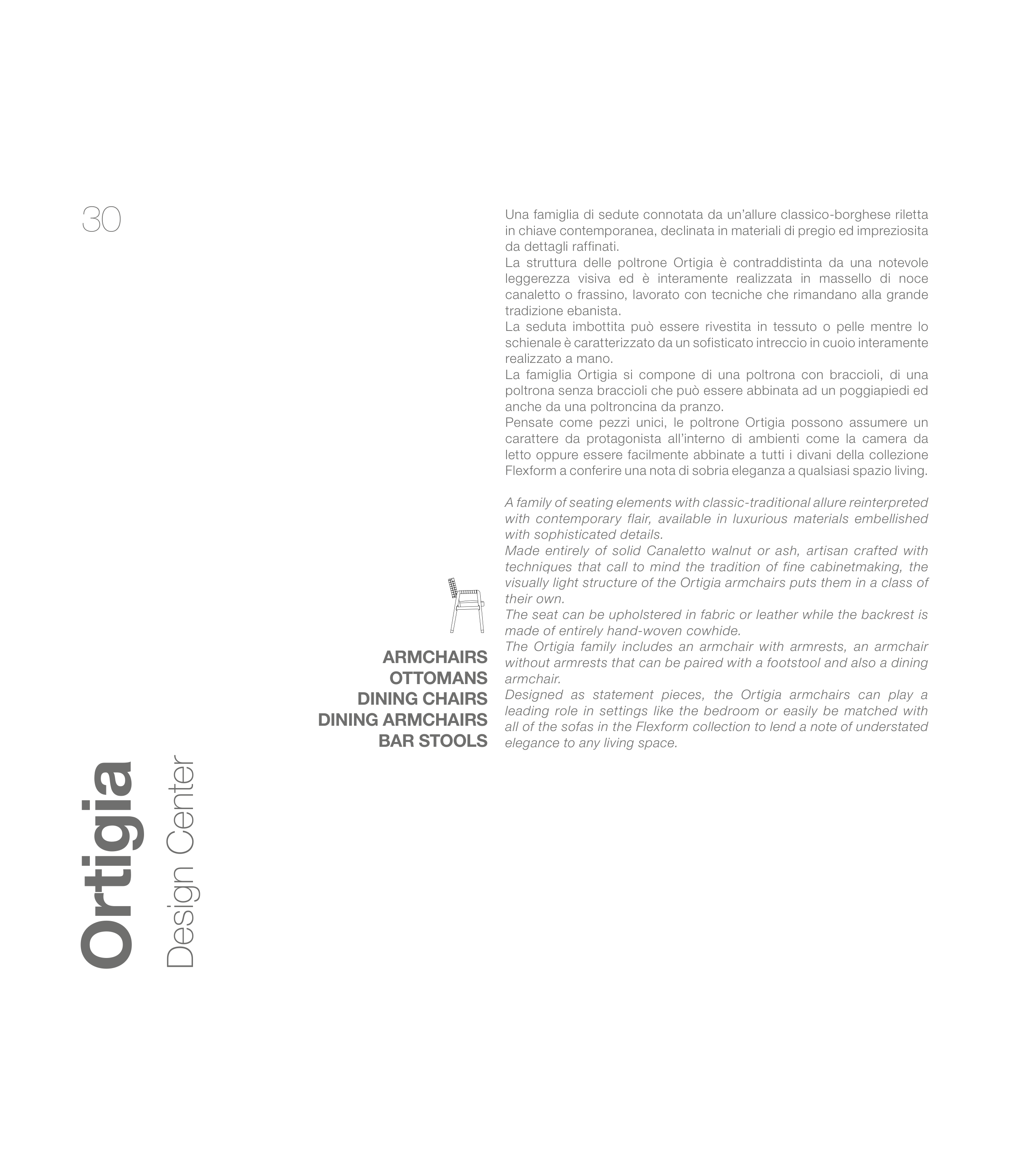 The Ortigia family includes an armchair with armrests, an armchair