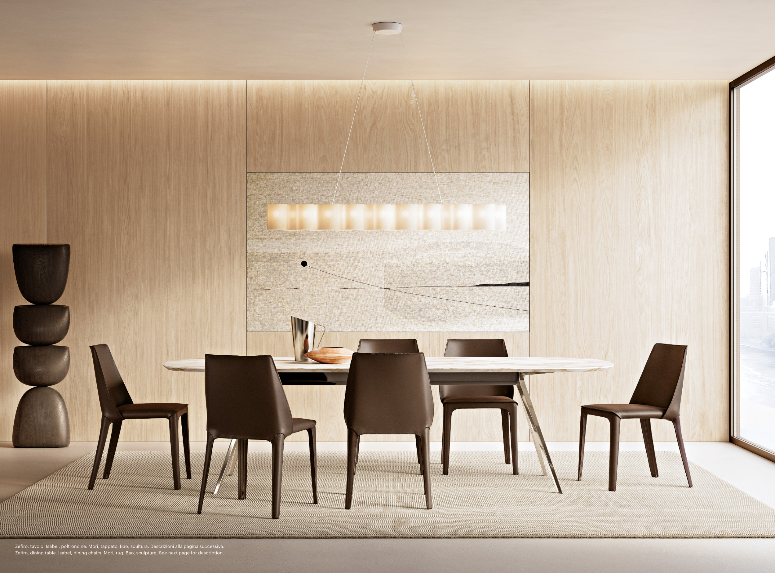 Zefiro, dining table. Isabel, dining chairs. Mori, rug. Bao, sculpture. See next page for description.