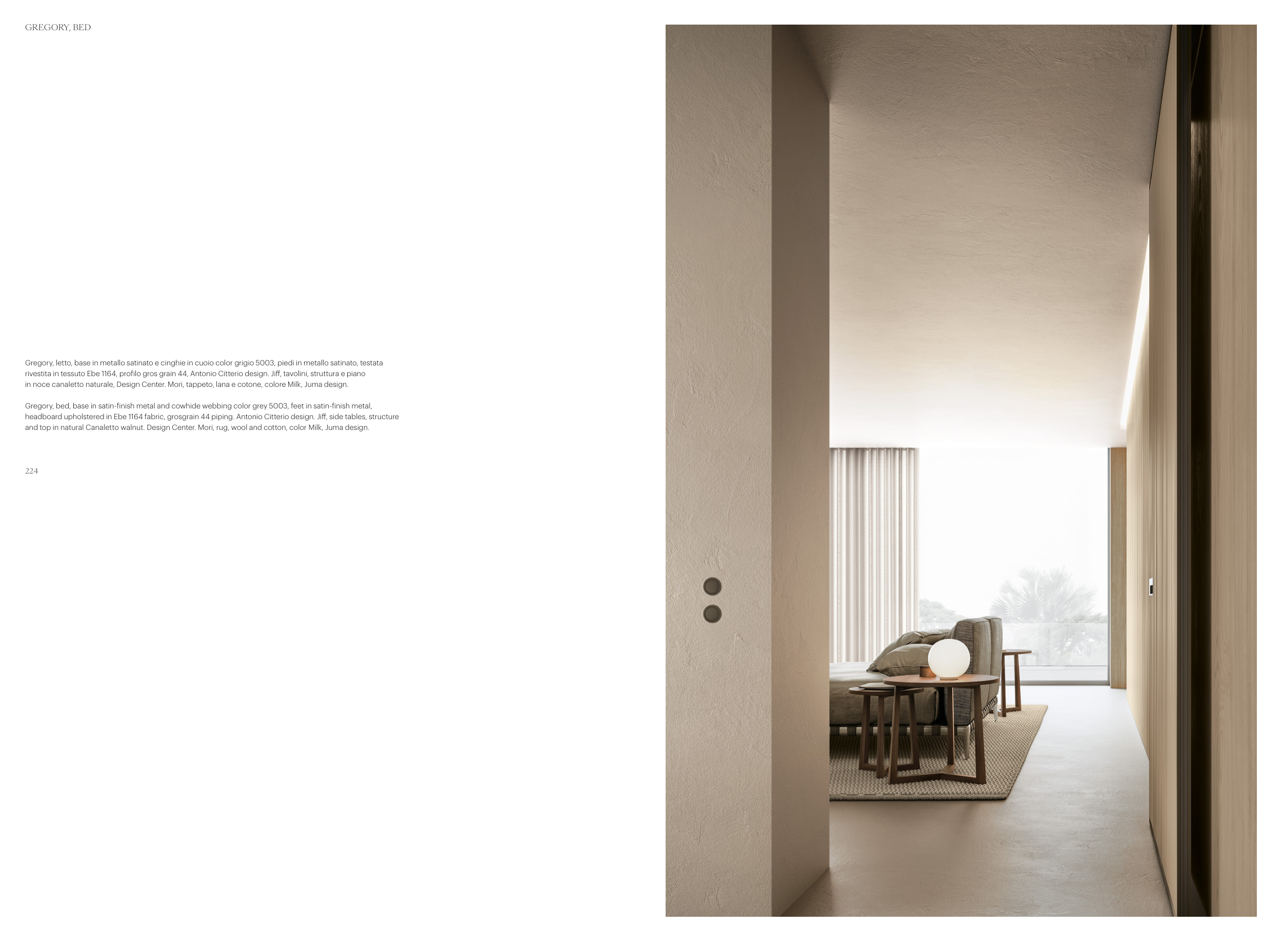 headboard upholstered in Ebe 1164 fabric, grosgrain 44 piping. Antonio Citterio design. Jiff, side tables, structure