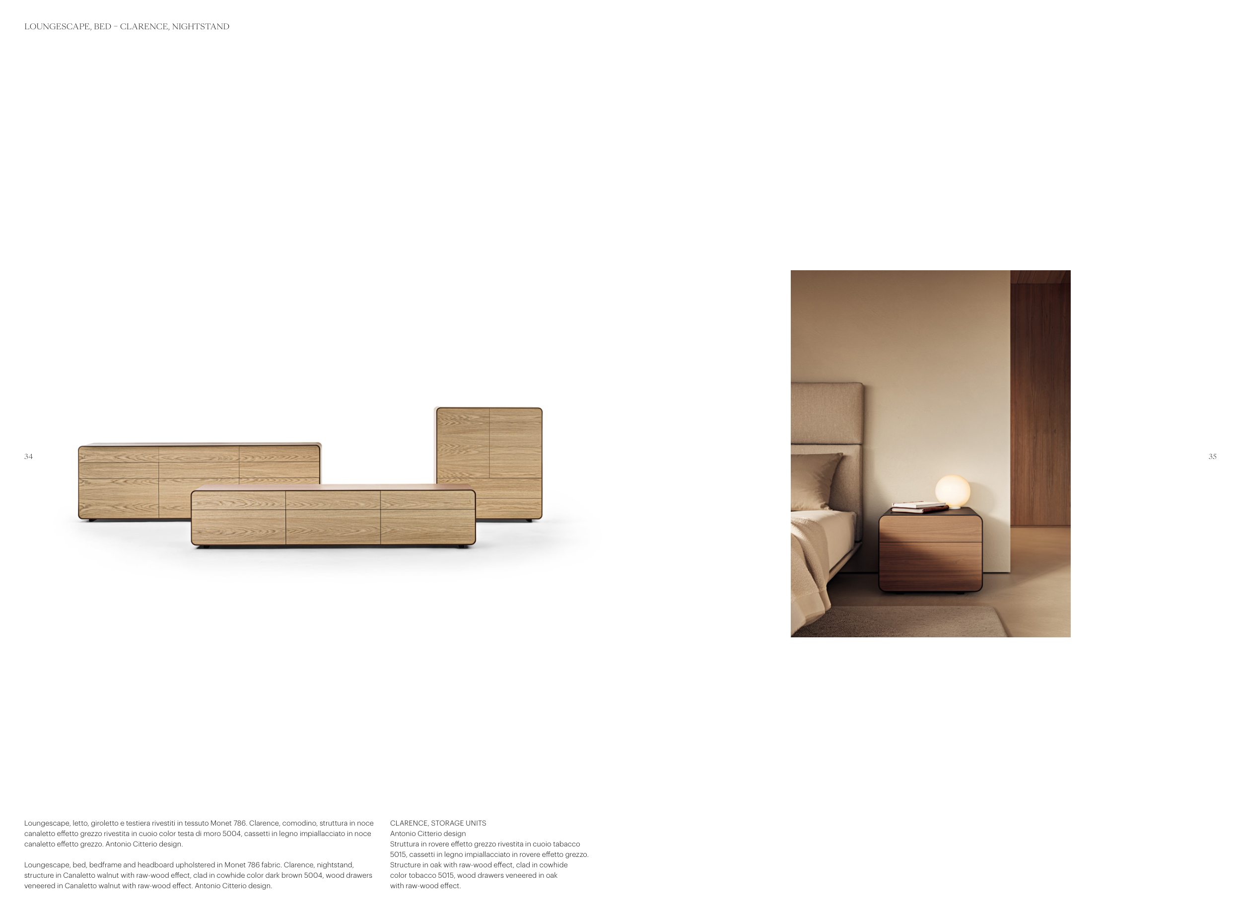 Loungescape, letto, giroletto e testiera rivestiti in tessuto Monet 786. Clarence, comodino, struttura in noce
