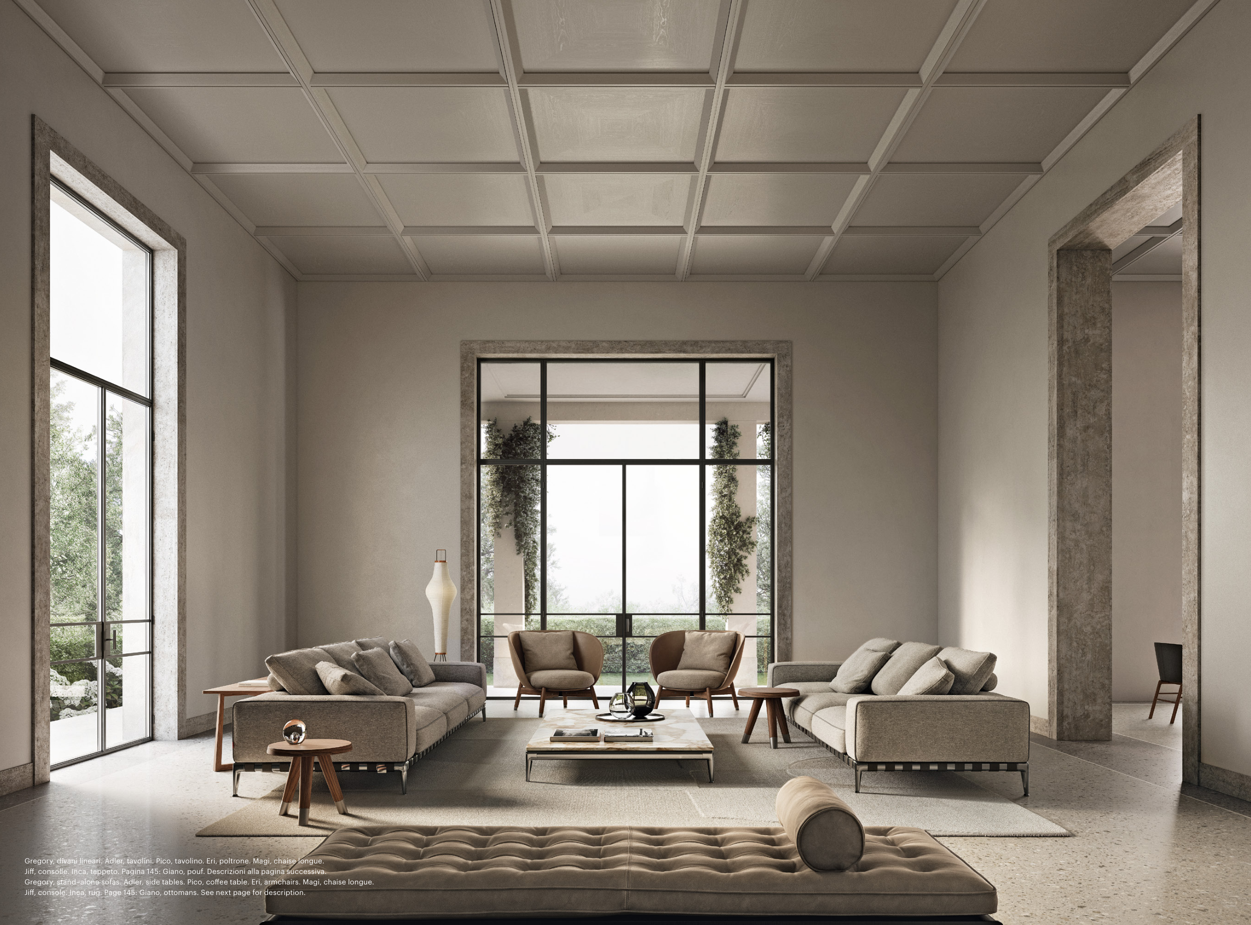 Gregory, divani lineari. Adler, tavolini. Pico, tavolino. Eri, poltrone. Magi, chaise longue.