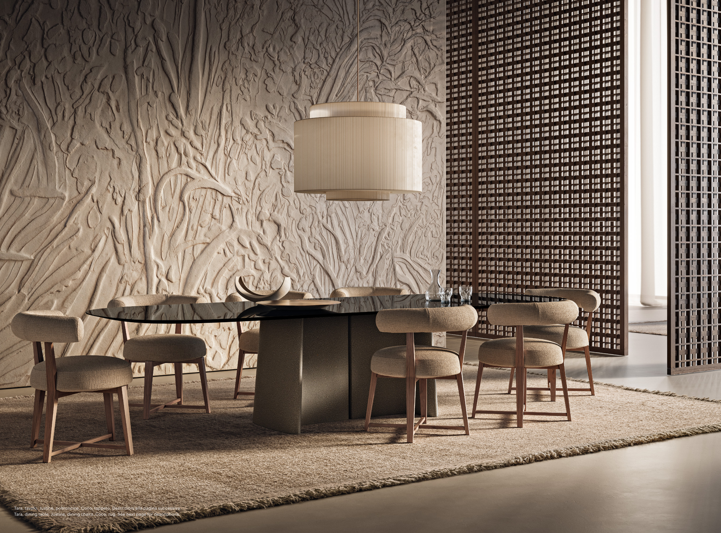 Tara, tavolo. Justine, poltroncine. Coco, tappeto. Descrizioni alla pagina successiva.