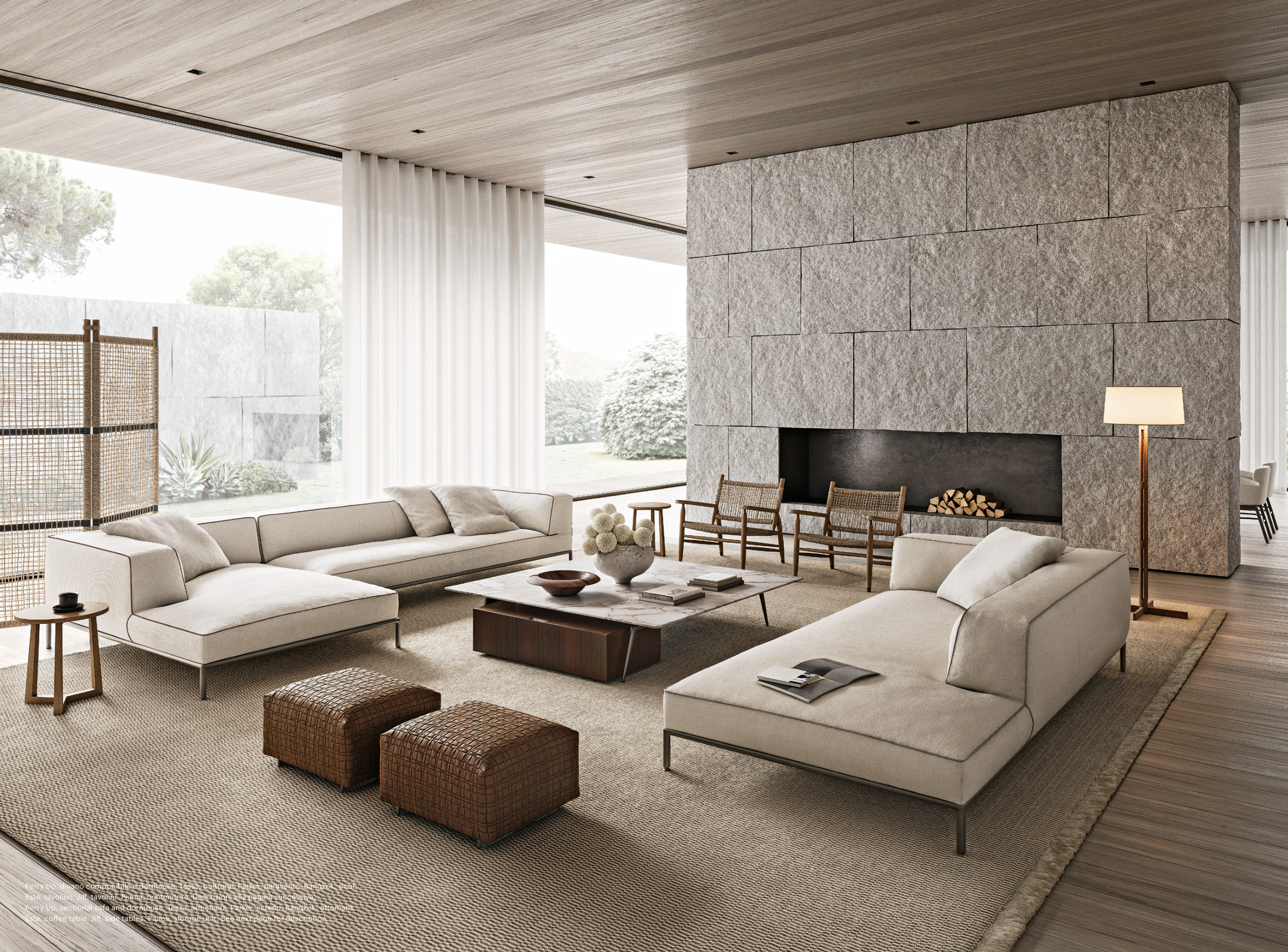 Perry Up, divano componibile e dormeuse, Tessa, poltrone. Parker, paravento. Bangkok, pouf.