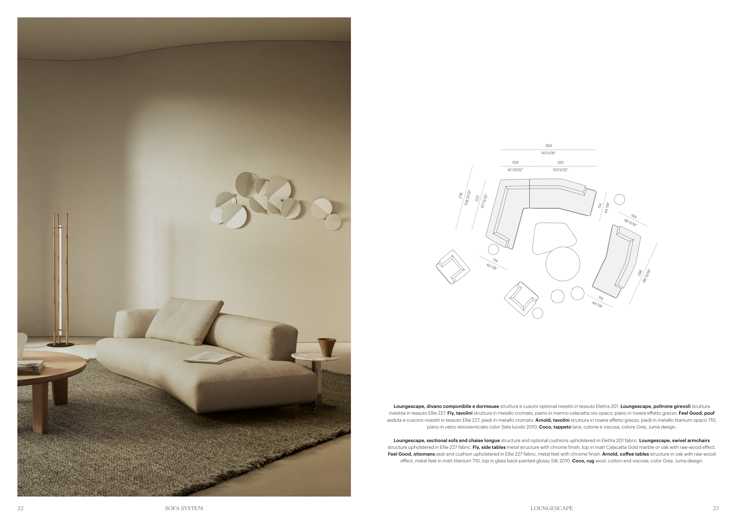 rivestita in tessuto Ellie 227. Fly, tavolini struttura in metallo cromato, piano in marmo calacatta oro opaco, piano in rovere effetto grezzo. Feel Good, pouf