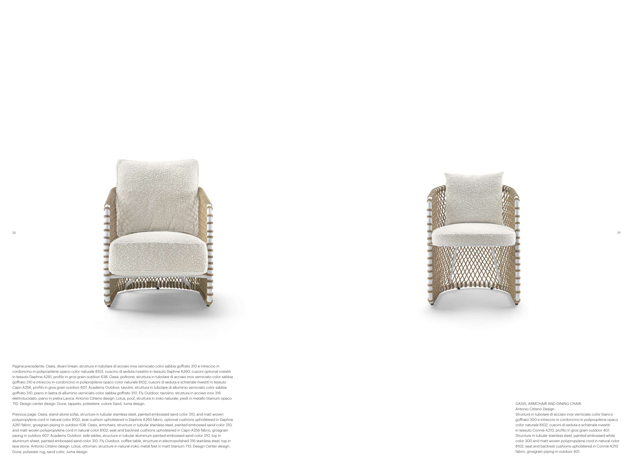 A261 fabric, grosgrain piping in outdoor 638. Oasis, armchairs, structure in tubular stainless steel, painted embossed sand color 310,