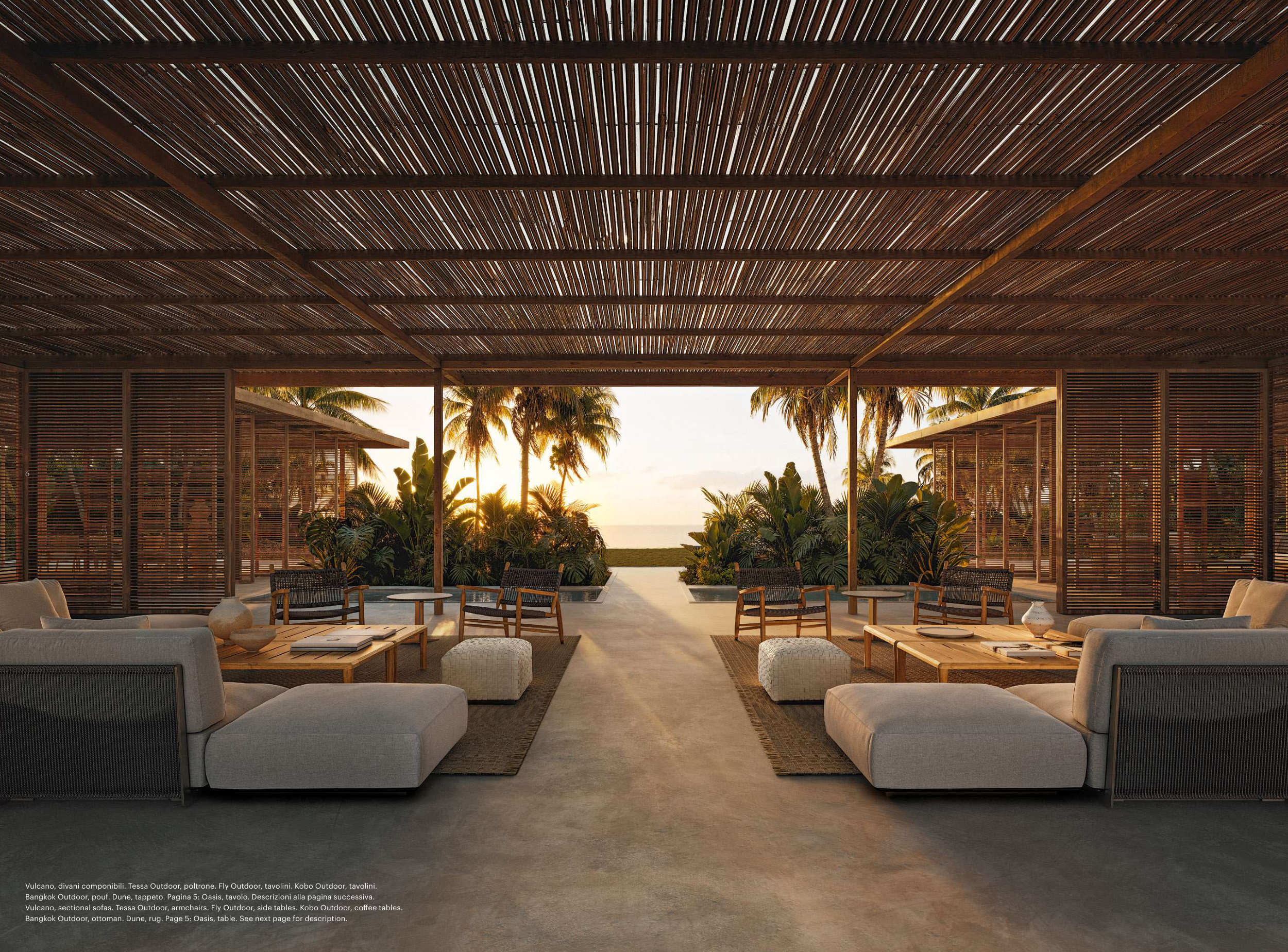 Vulcano, sectional sofas. Tessa Outdoor, armchairs. Fly Outdoor, side tables. Kobo Outdoor, coffee tables.