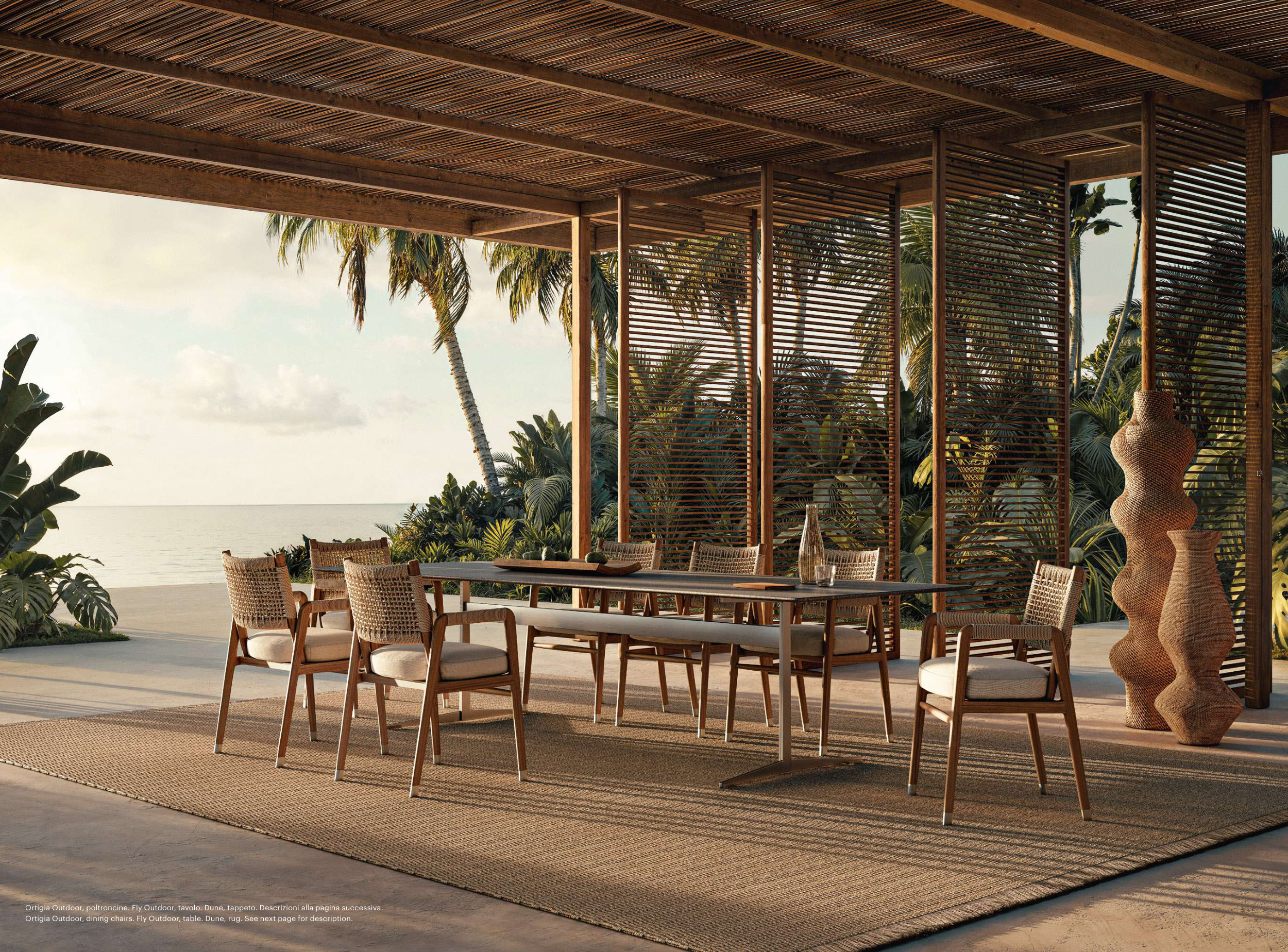 Ortigia Outdoor, dining chairs. Fly Outdoor, table. Dune, rug. See next page for description.