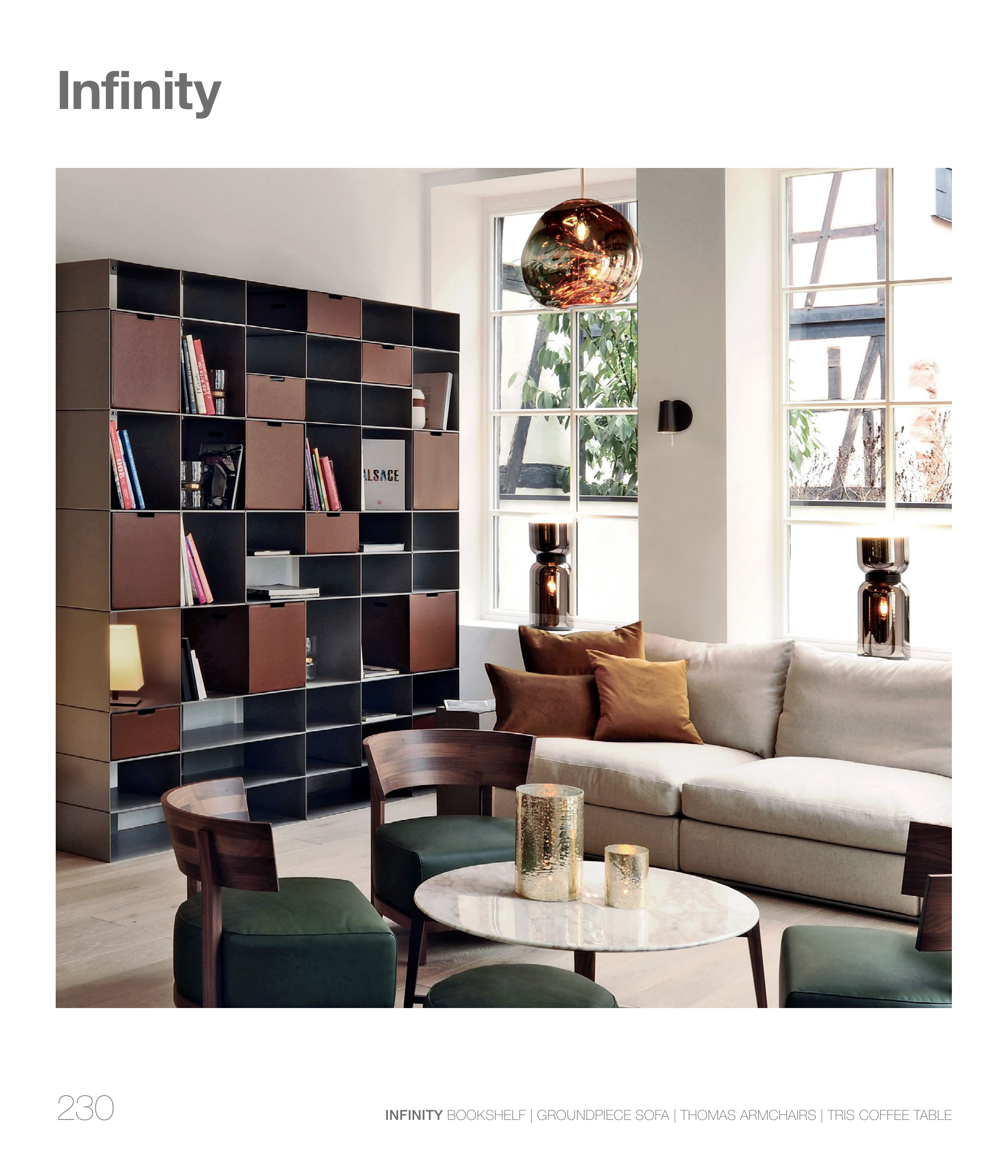 INFINITY BOOKSHELF | GROUNDPIECE SOFA | THOMAS ARMCHAIRS | TRIS COFFEE TABLE