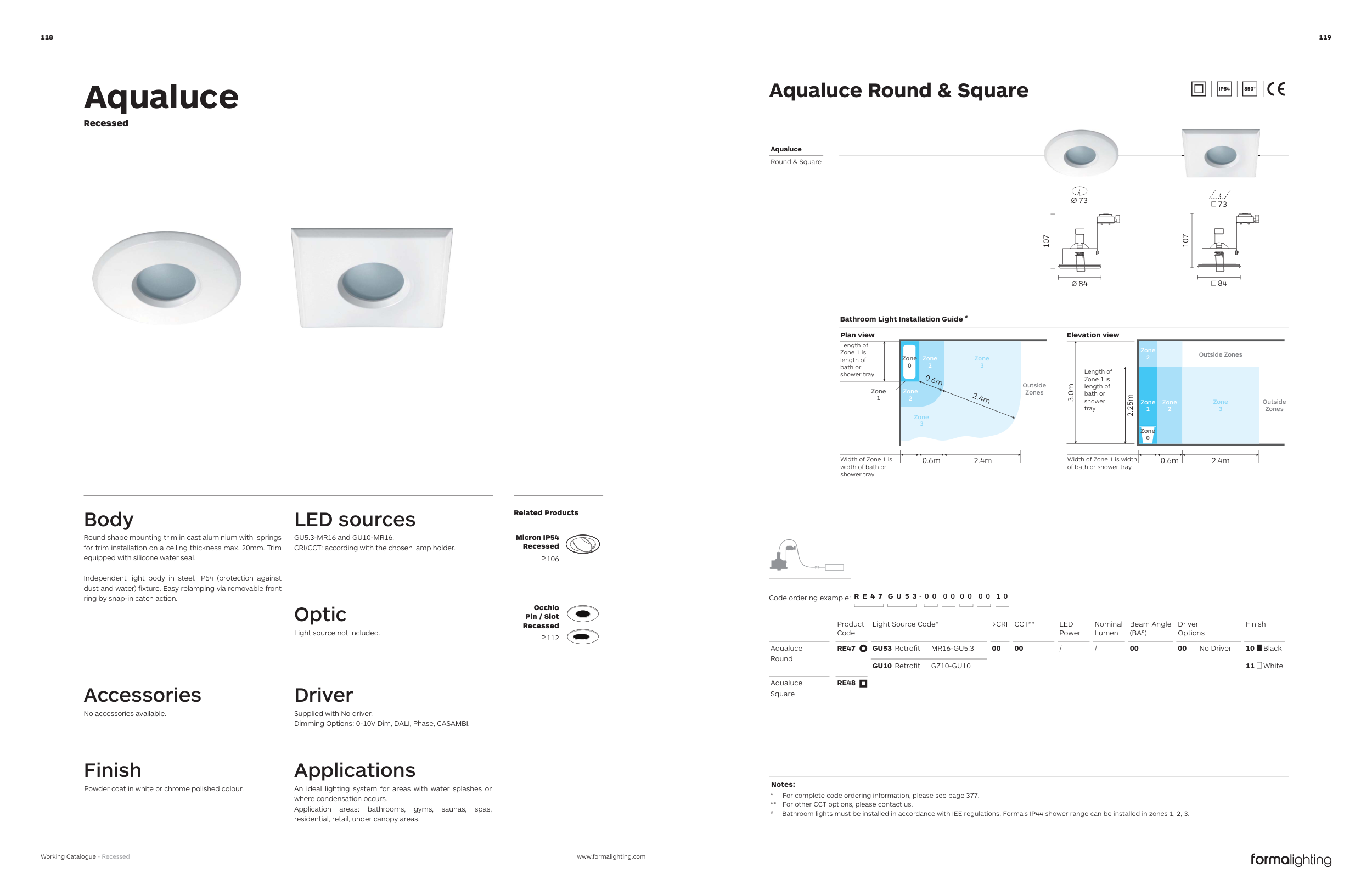 # Bathroom lights must be installed in accordance with IEE regulations, Forma’s IP44 shower range can be installed in zones 1, 2, 3.