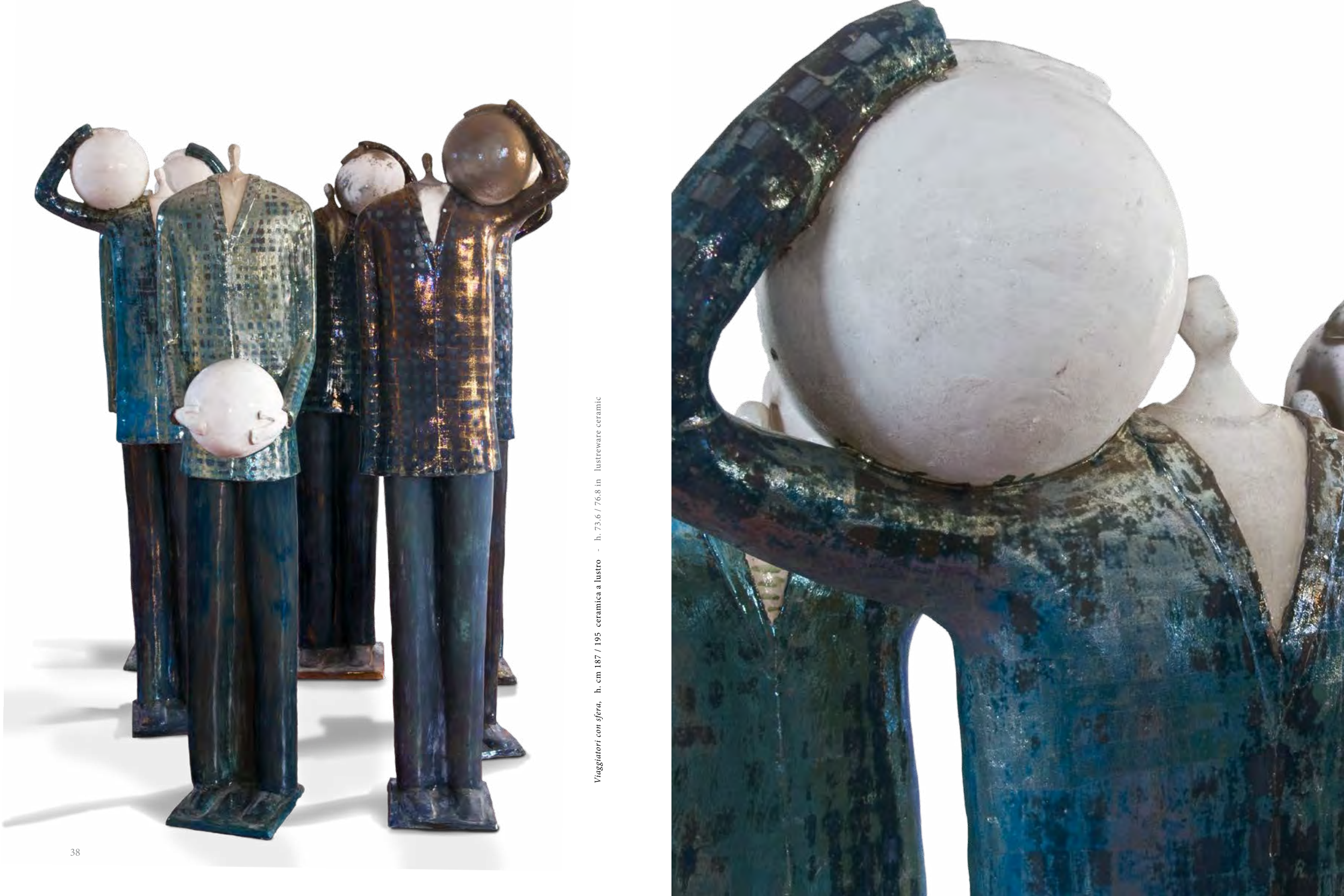 Viaggiatori con sfera, h. cm 187 / 195 ceramica a lustro - h. 73.6 / 76.8 in lustreware ceramic