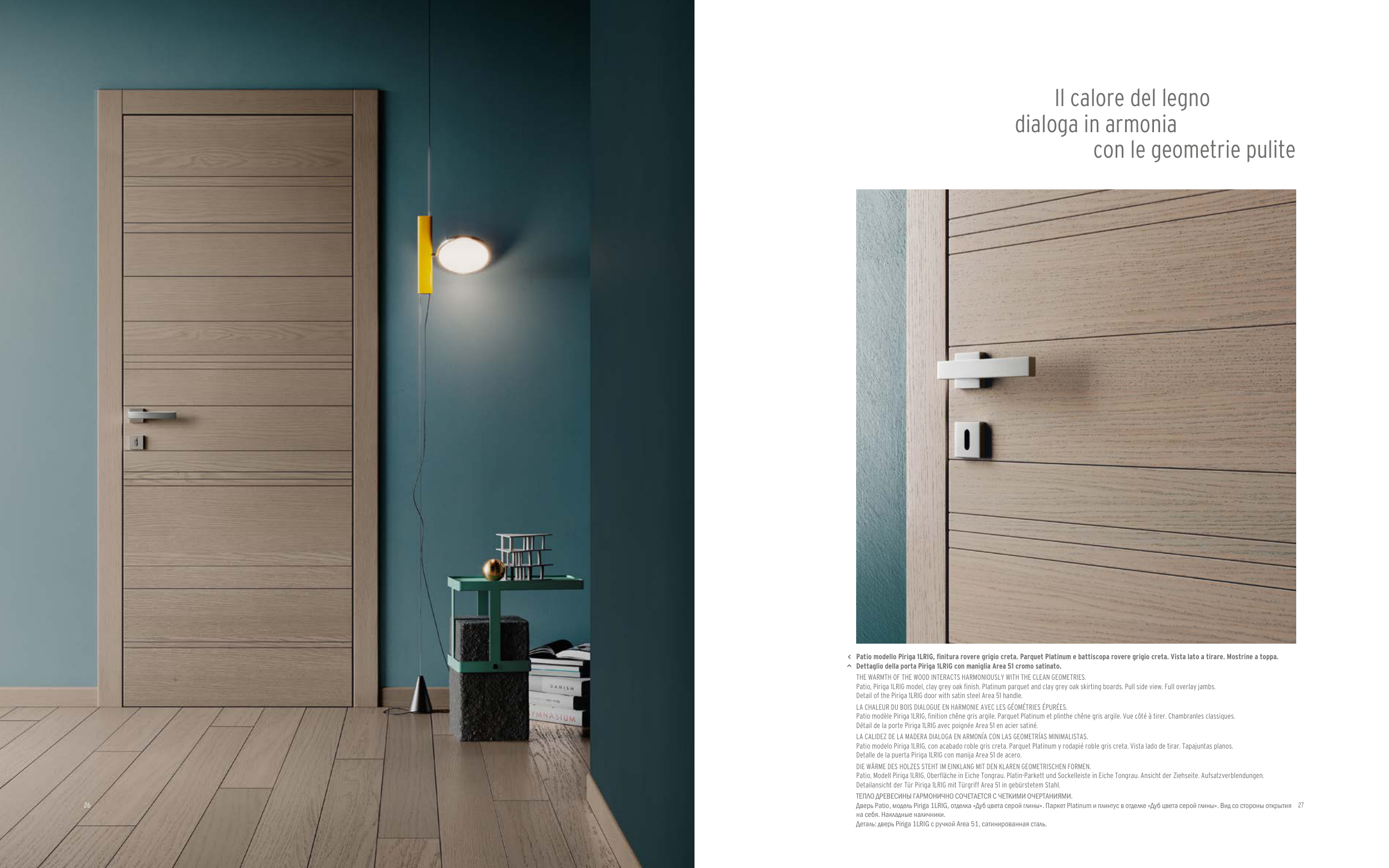 Patio modello Piriga 1LRIG, finitura rovere grigio creta. Parquet Platinum e battiscopa rovere grigio creta. Vista lato a tirare. Mostrine a toppa.