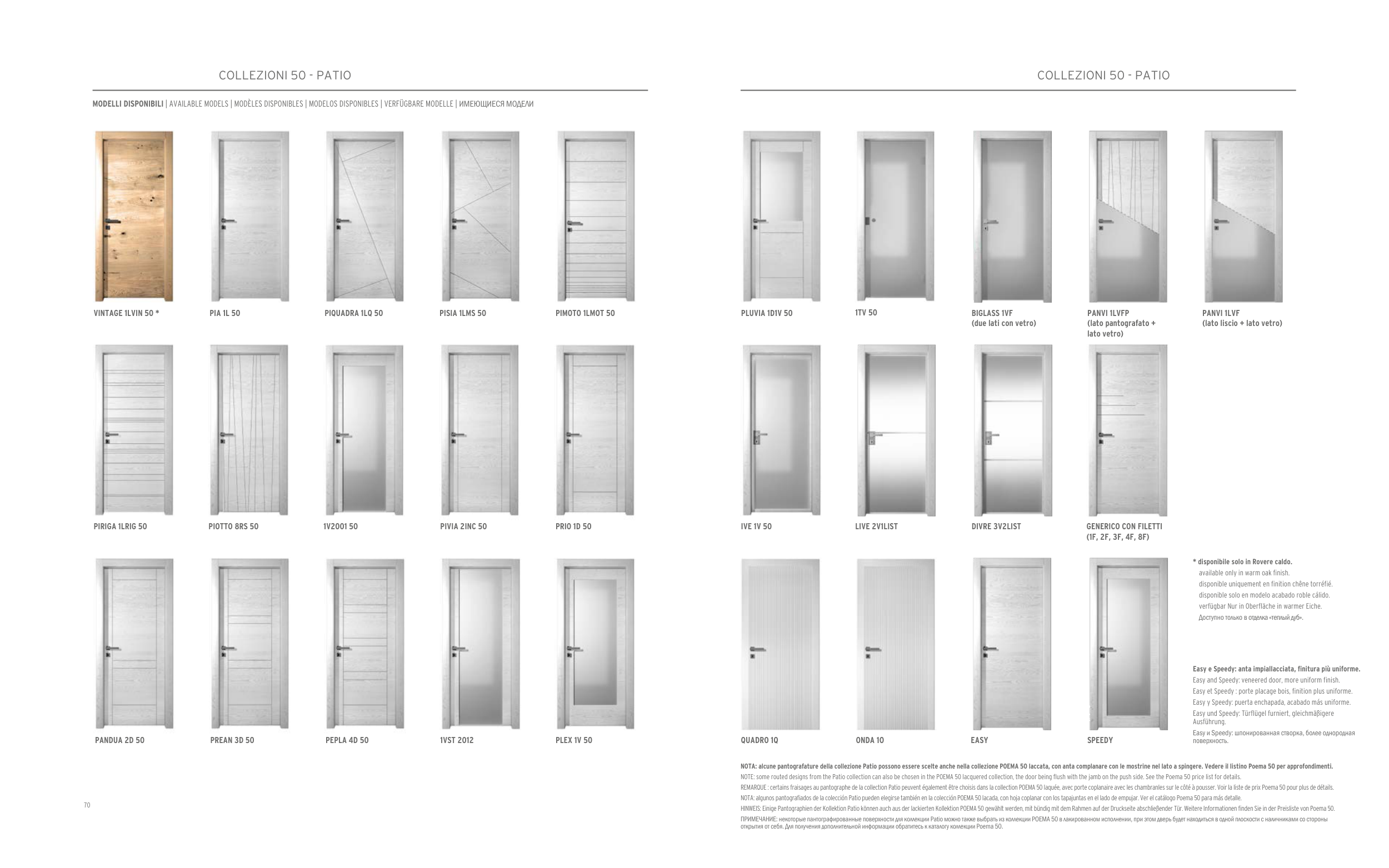REMARQUE : certains fraisages au pantographe de la collection Patio peuvent également être choisis dans la collection POEMA 50 laquée, avec porte coplanaire avec les chambranles sur le côté à pousser. Voir la liste de prix Poema 50 pour plus de détails.