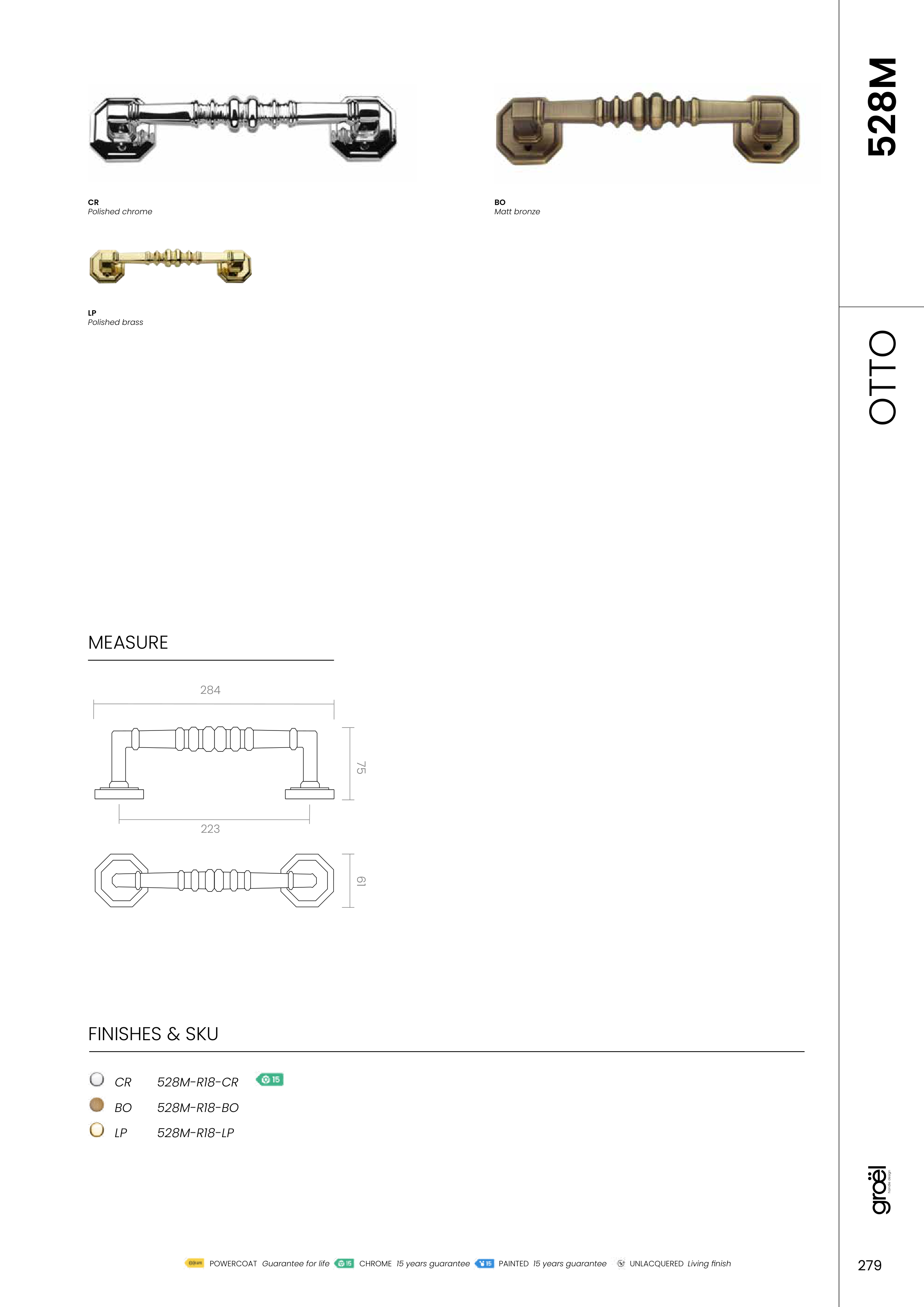 279 POWERCOAT Guarantee for life CHROME 15 years guarantee PAINTED 15 years guarantee UNLACQUERED Living finish BO Polished chrome Matt bronze CR CR BO LP 528M-R18-CR 528M-R18-BO 528M-R18-LP Polished brass LP 61 75 284 223 OTTO MEASURE FINISHES & SKU 528M