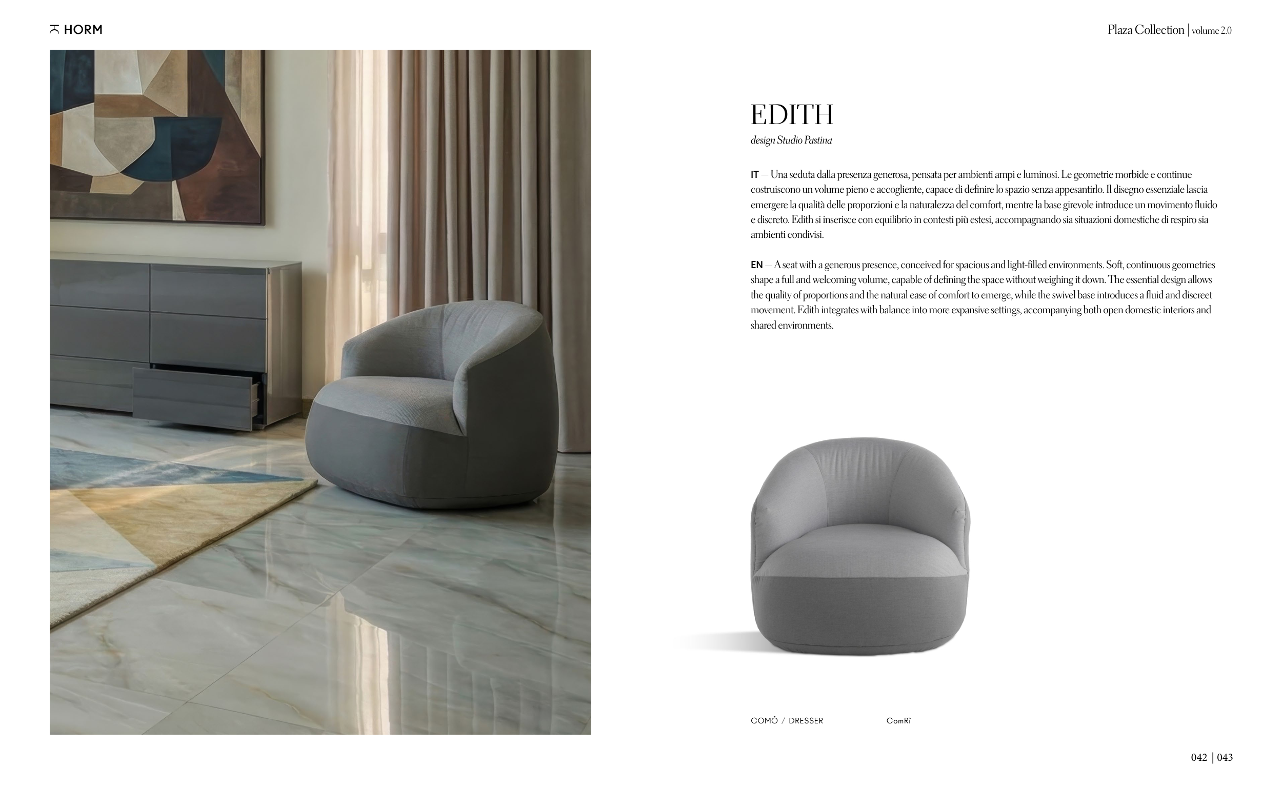 EN — A seat with a generous presence, conceived for spacious and light-filled environments. Soft, continuous geometries