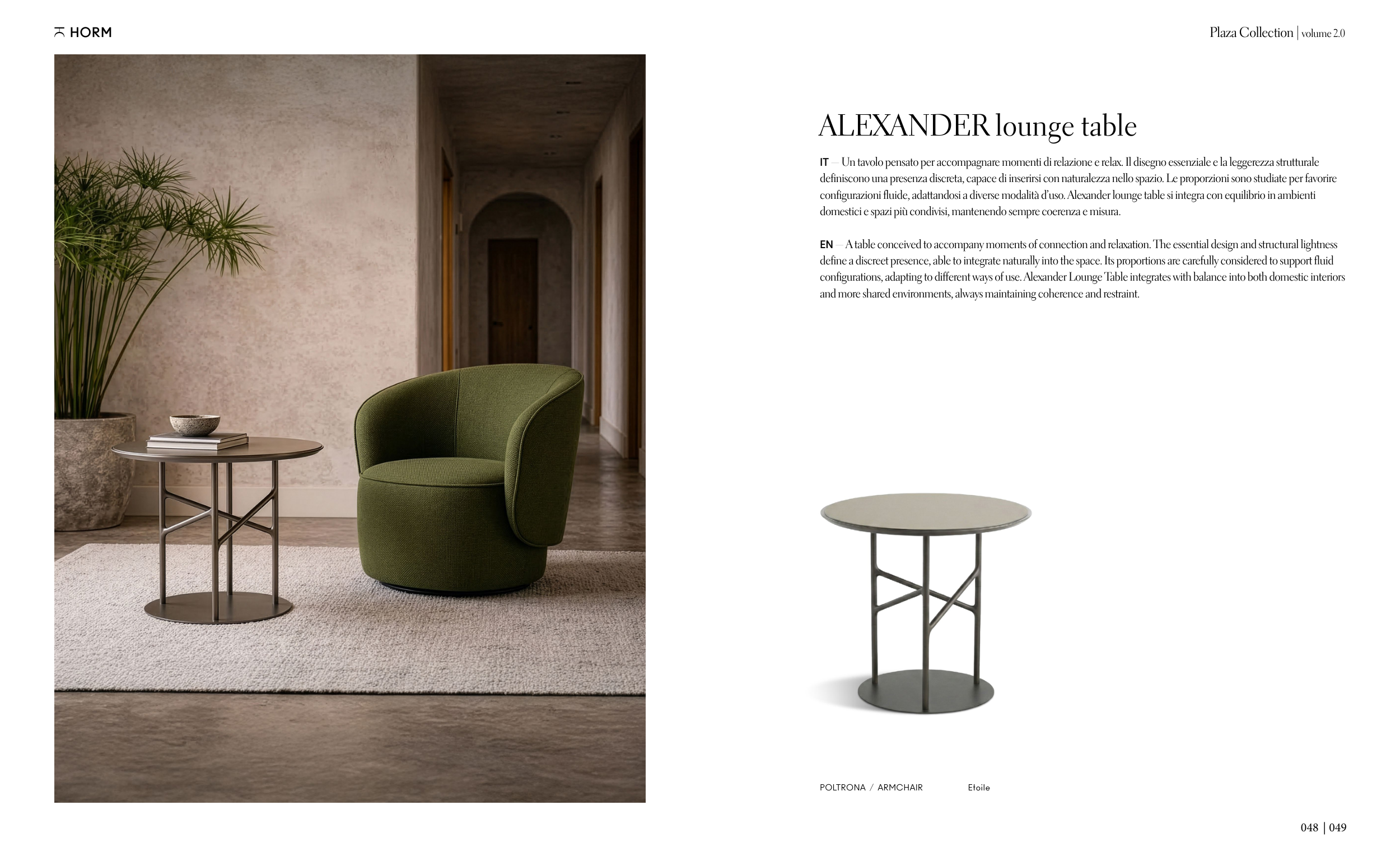 configurations, adapting to different ways of use. Alexander Lounge Table integrates with balance into both domestic interiors