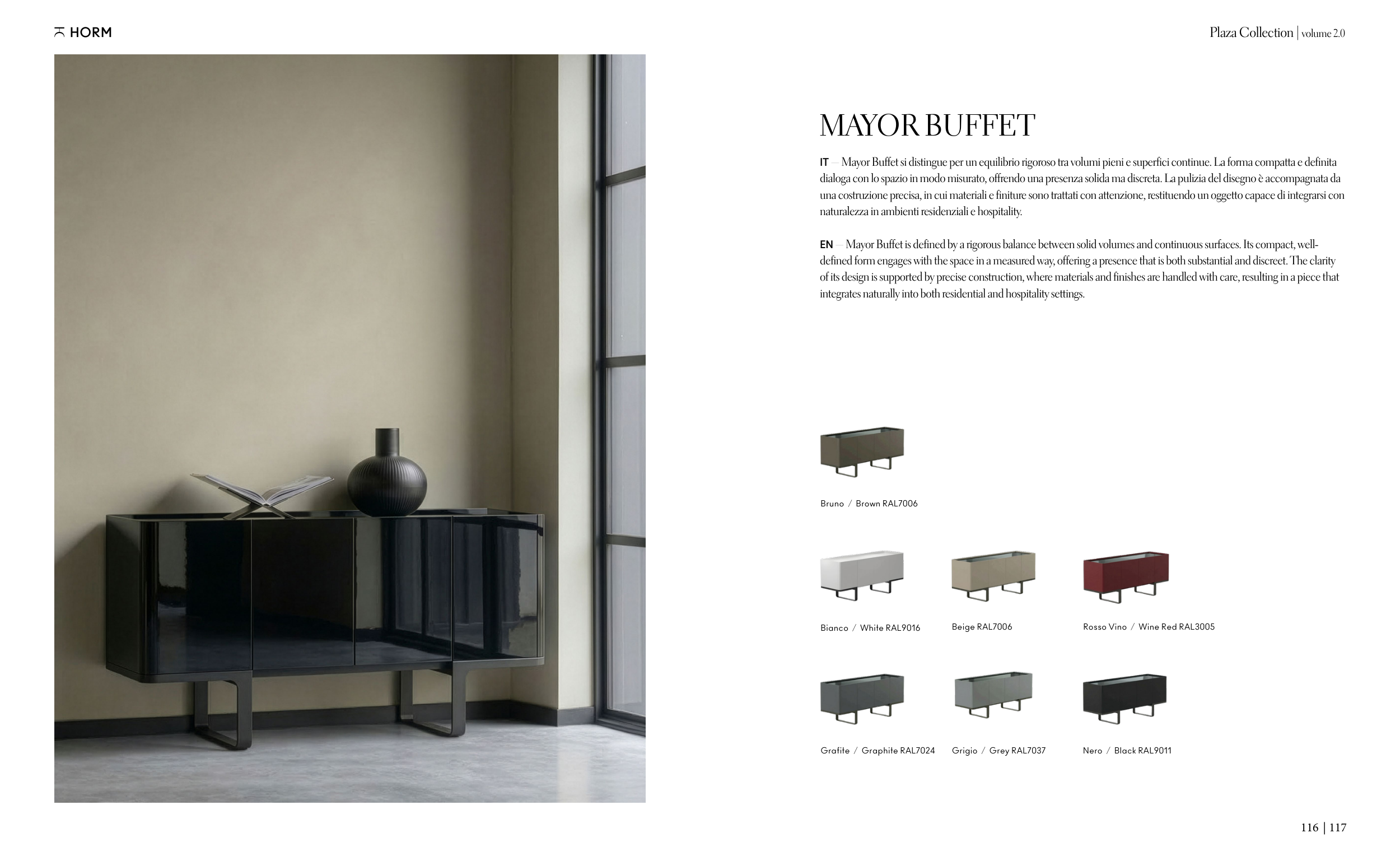 EN — Mayor Buffet is defined by a rigorous balance between solid volumes and continuous surfaces. Its compact, well-