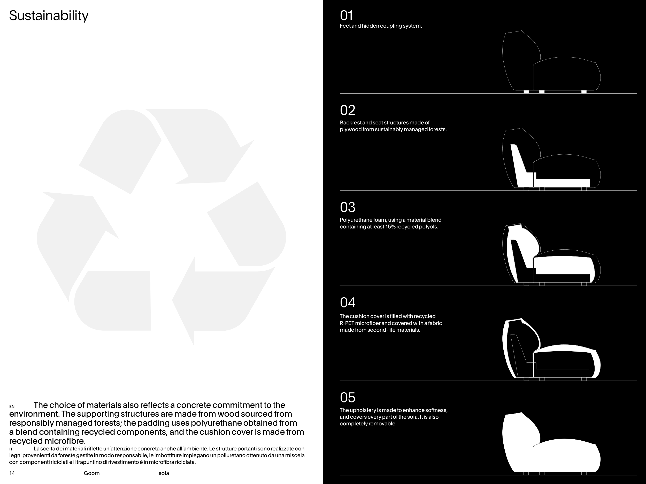 con componenti riciclati e il trapuntino di rivestimento è in microfibra riciclata.