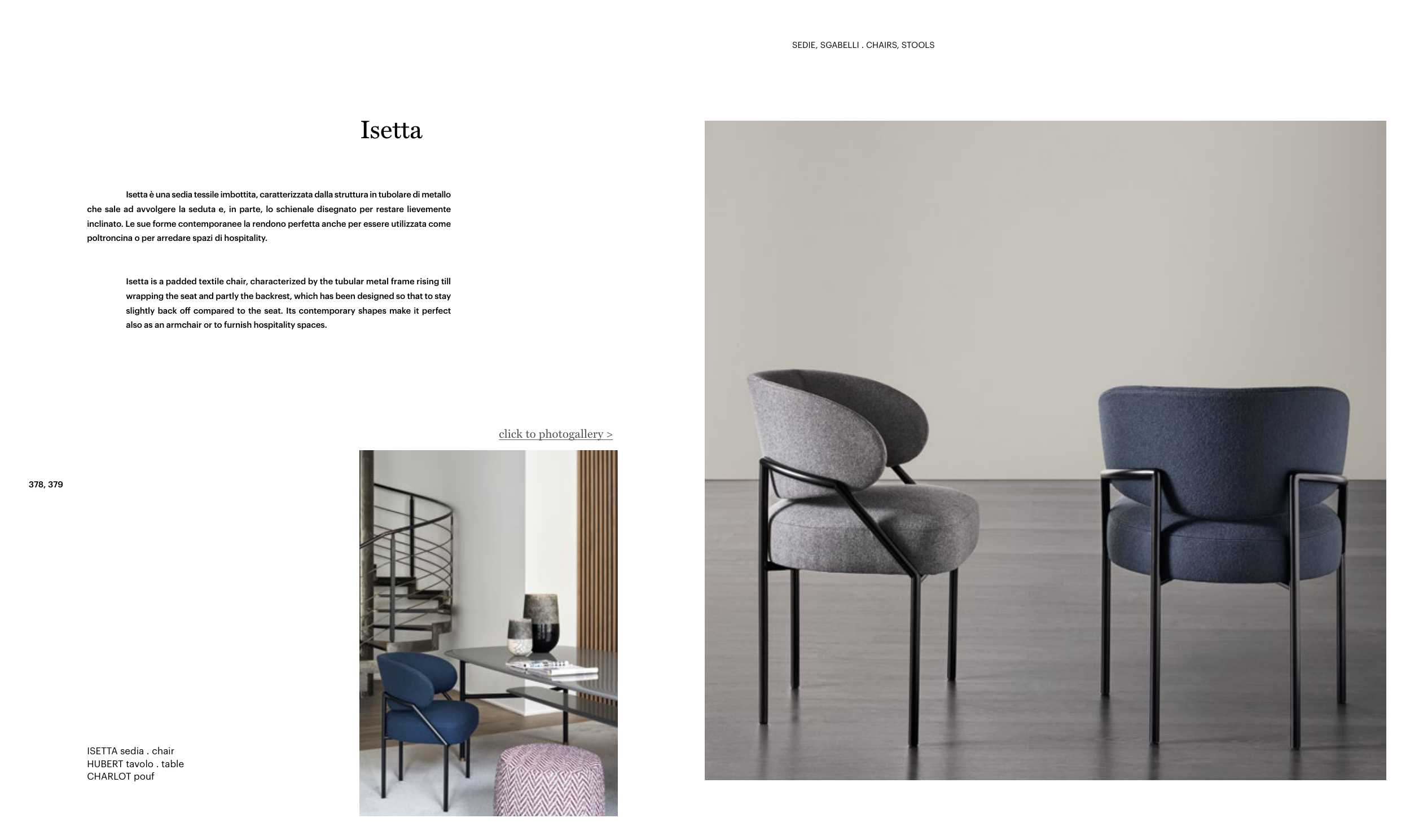 Isetta is a padded textile chair, characterized by the tubular metal frame rising till