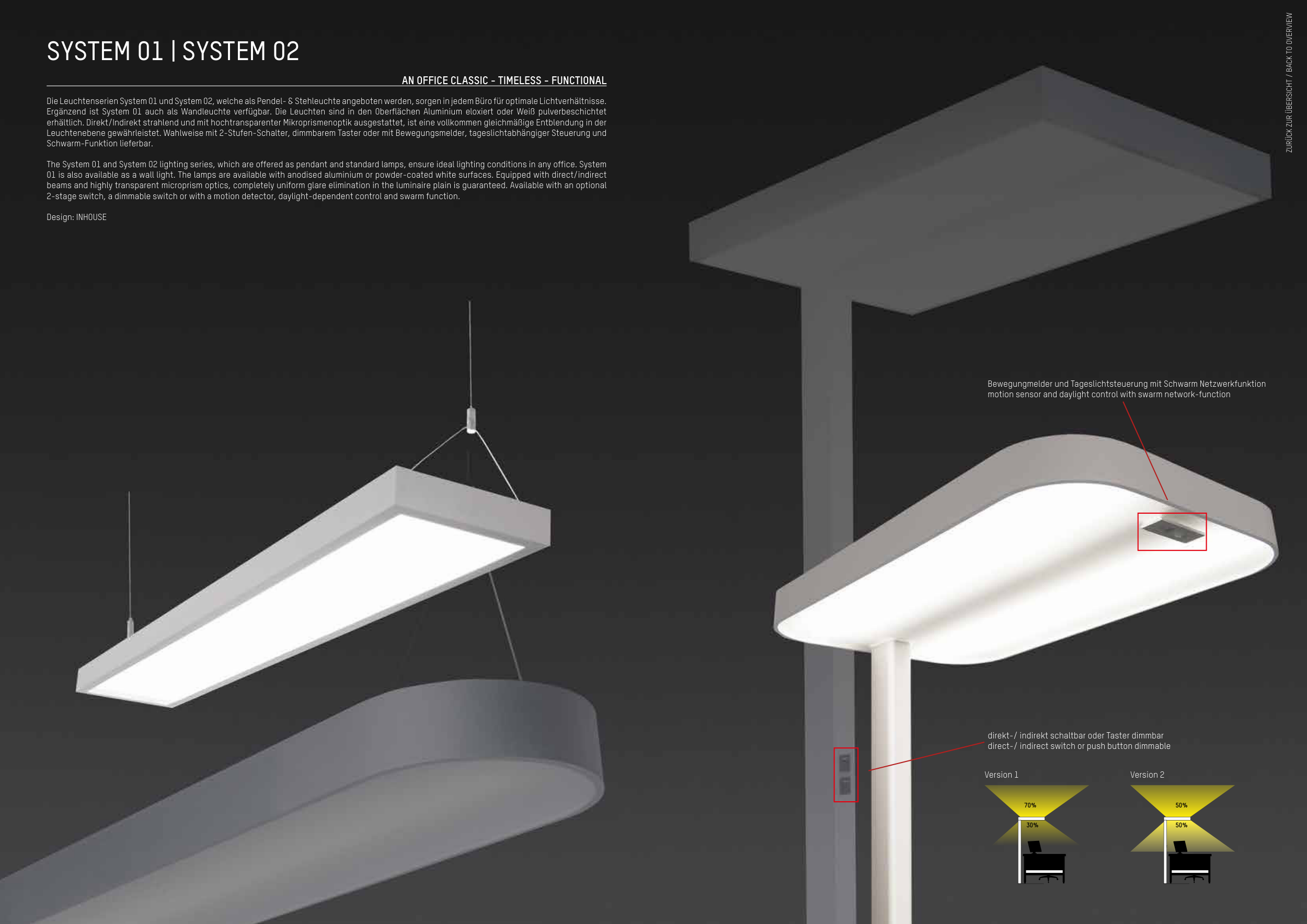 The System 01 and System 02 lighting series, which are offered as pendant and standard lamps, ensure ideal lighting conditions in any office. System