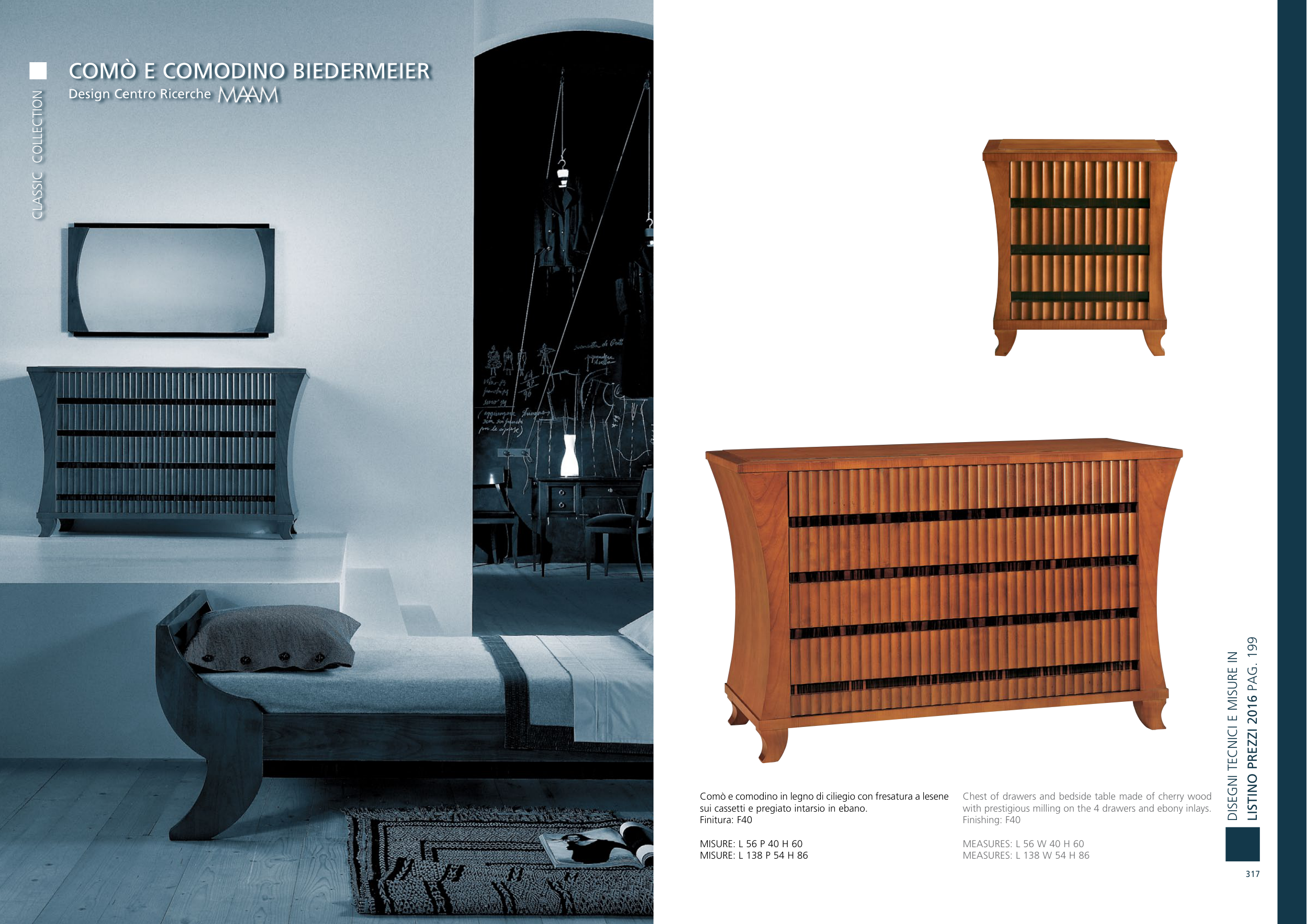 Comò e comodino in legno di ciliegio con fresatura a lesene