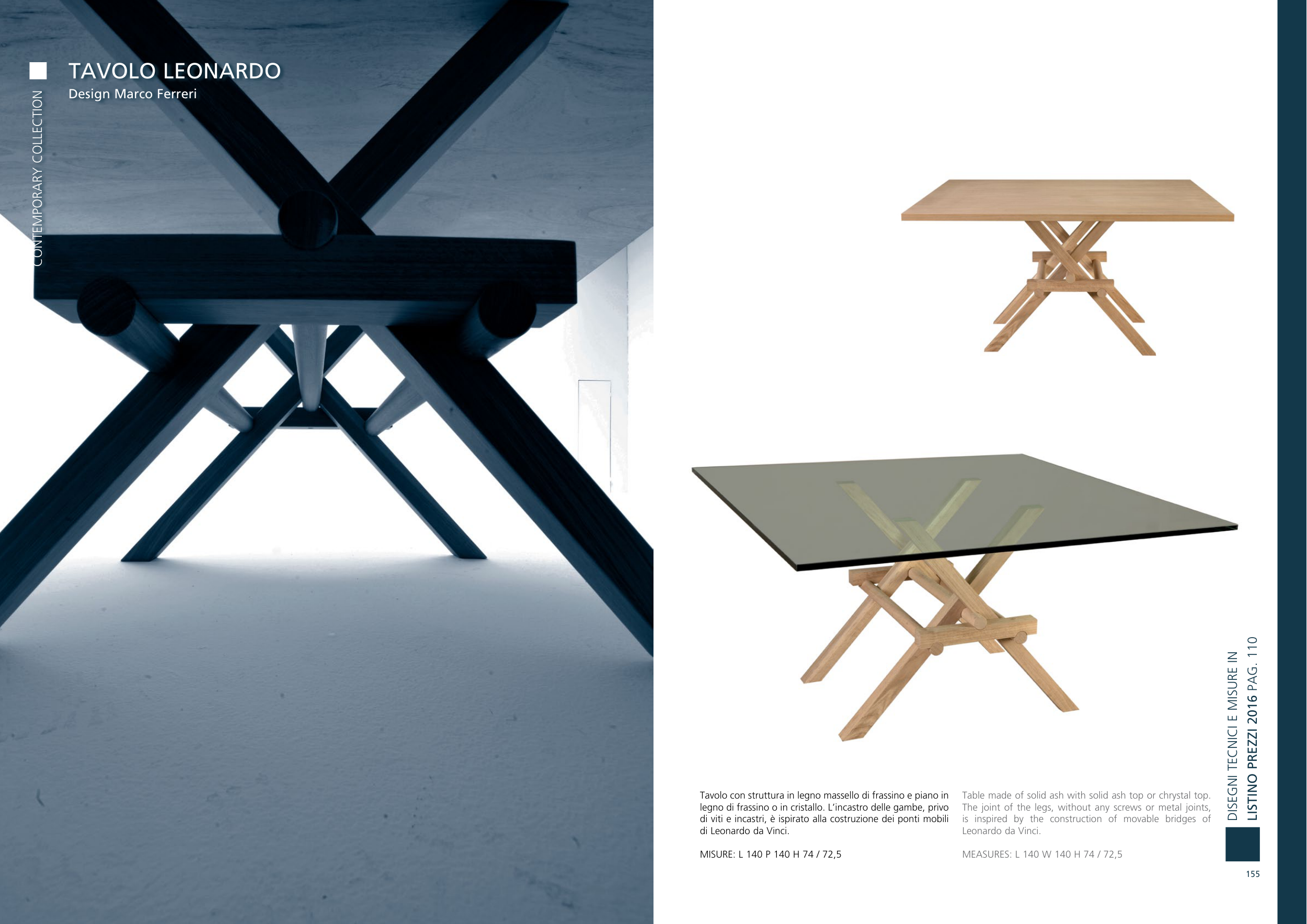 legno di frassino o in cristallo. L’incastro delle gambe, privo