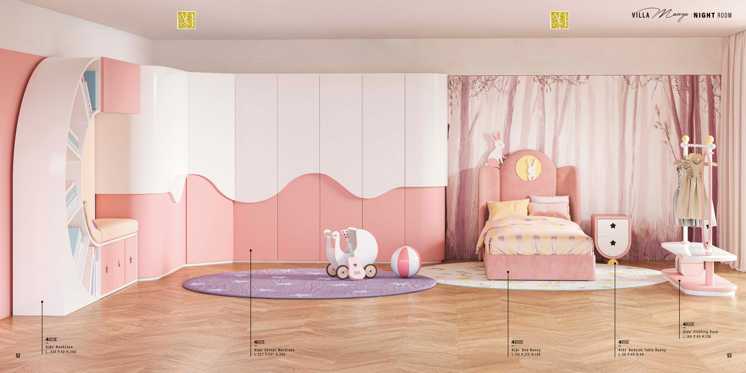 4800E Kids’ Bed Bunny L .110 P.215 H.139 4821E Kids’ Corner Wardrobe L .327 P.237 H.200 4810E Kids’ Bedside Table Bunny L .38 P.40 H.40 4820E Kids’ Clothing Rack L .160 P.45 H.136 4823E Kids’ Bookcase L . 224 P.42 H.200 V I L L A Manya / NIGHT ROOM 53 52