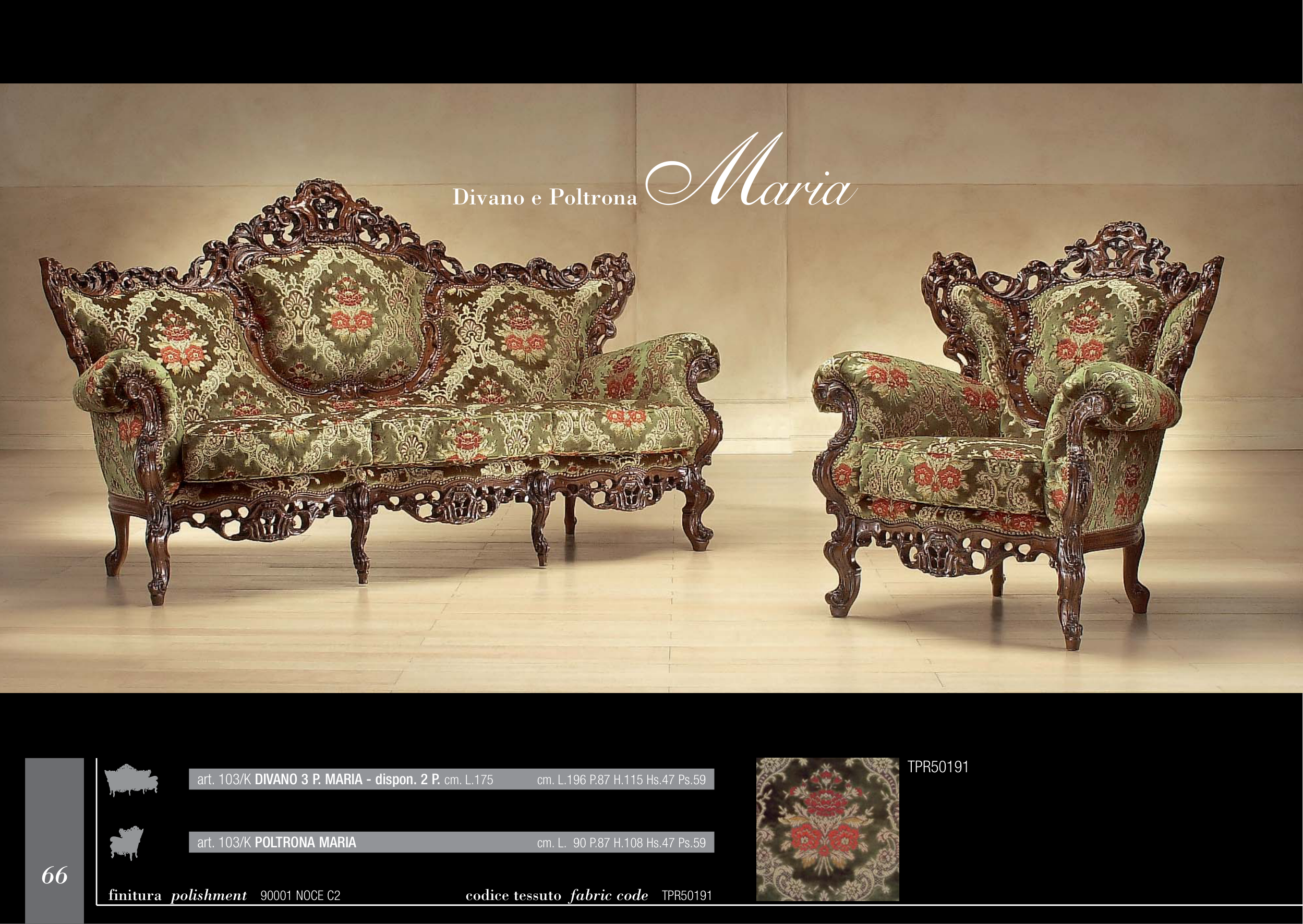 Divano e Poltrona Maria art. 103/K DIVANO 3 P. MARIA - dispon. 2 P. cm. L.175 cm. L.196 P.87 H.115 Hs.47 Ps.59 art. 103/K POLTRONA MARIA cm. L.290 P.87 H.108 Hs.47 Ps.59 finitura polishment 90001 NOCE C2 codice tessuto fabric code TPR50191 TPR50191 66