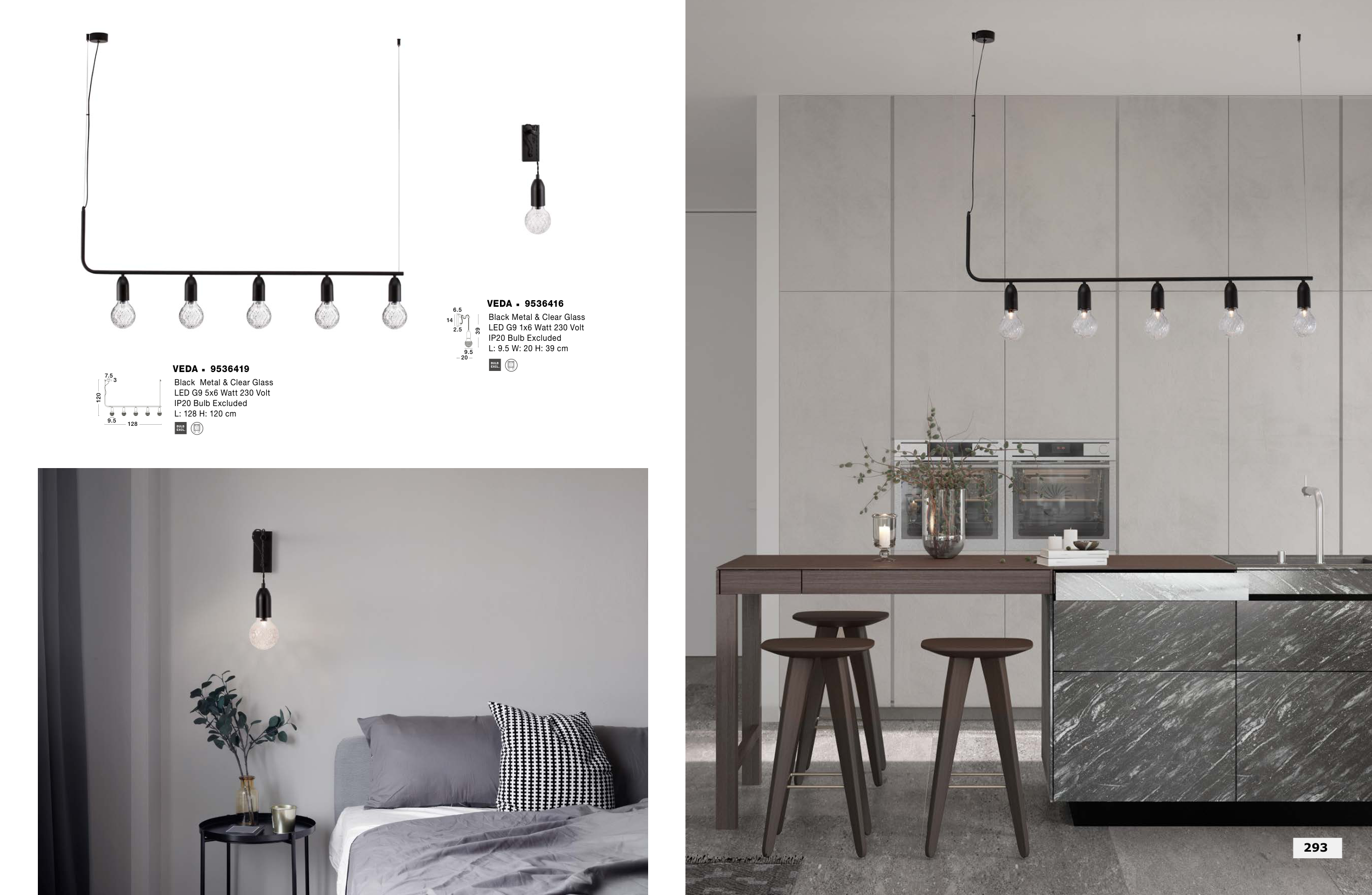 VEDA ˙ 9536416 Black Metal & Clear Glass LED G9 1x6 Watt 230 Volt IP20 Bulb Excluded L: 9.5 W: 20 H: 39 cm 20 6.5 14 9.5 39 2.5 VEDA ˙ 9536419 Black Metal & Clear Glass LED G9 5x6 Watt 230 Volt IP20 Bulb Excluded L: 128 H: 120 cm 7.5 128 3 9.5 120 293